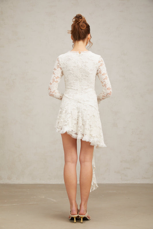 Cynthia Beyaz Asimetrik Çiçek İşlemeli Dantel Mini Elbise