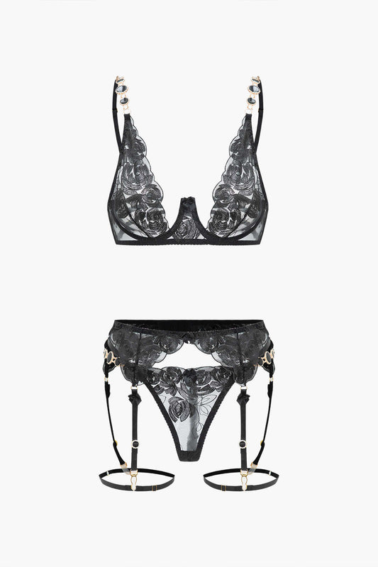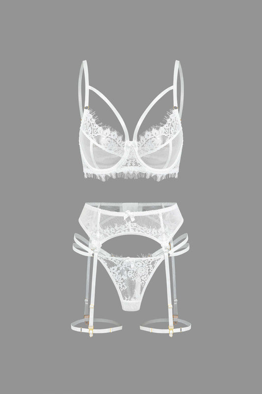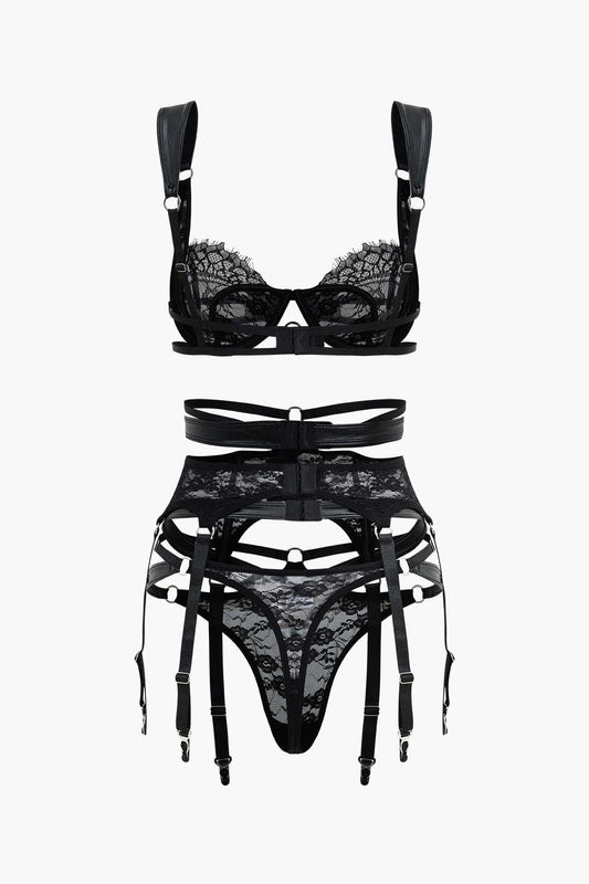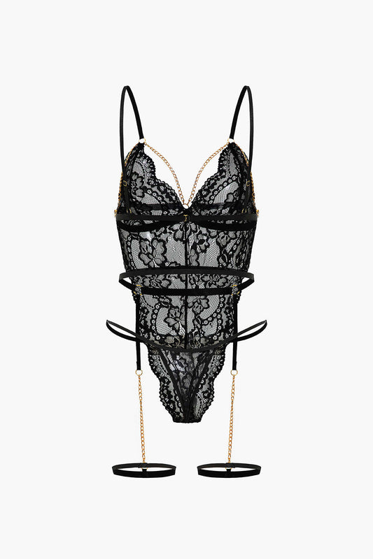 Dantel Metalik Zincir Kesik Detaylı Şeffaf İç Giyim Garter Seti