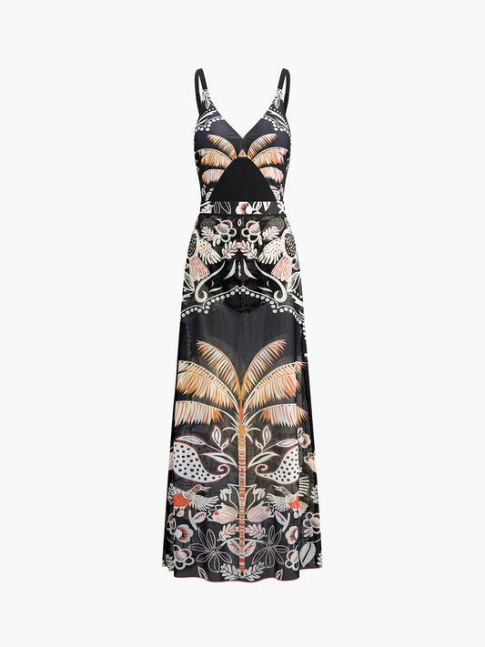 Hindistan Cevizi Palmiye Baskılı Yırtmaçlı Uzun Elbise