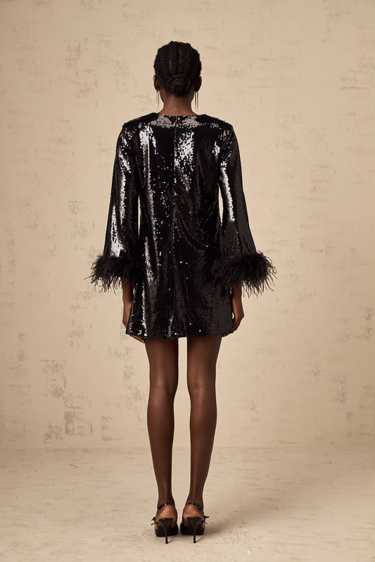 35% İndirimKina Siyah Tüy Manşetli Pullu Mini Elbise
