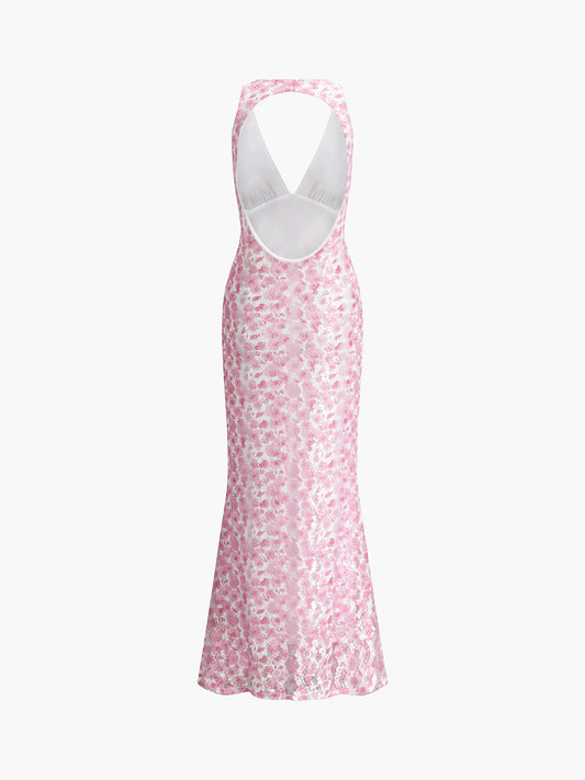 36% İndirimKiraz Çiçeği Halter Sırtı Açık Uzun Elbise