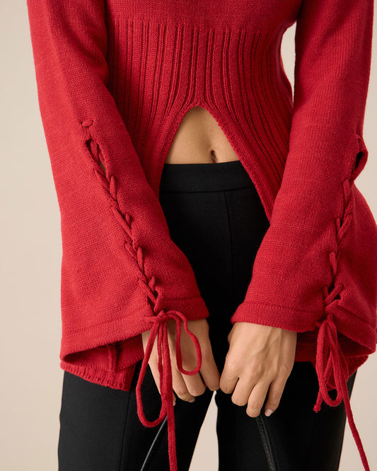 44% İndirimKırmızı Fırfırlı Kol Yırtmaçlı Kazak
