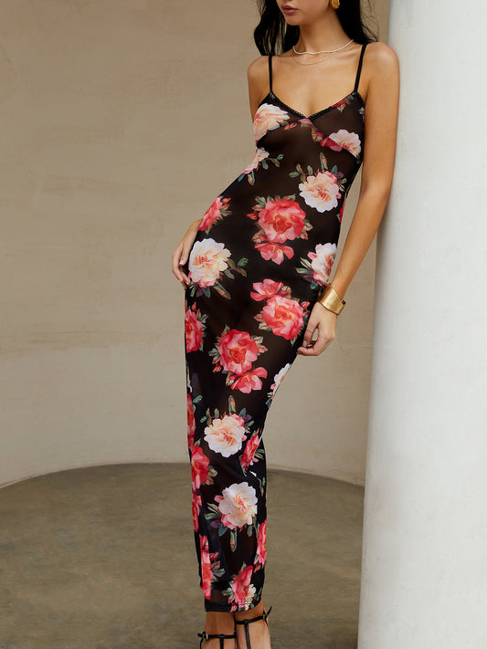 Şifon Şeffaf Puantiye Baskı Sırtı Açık Uzun Elbise