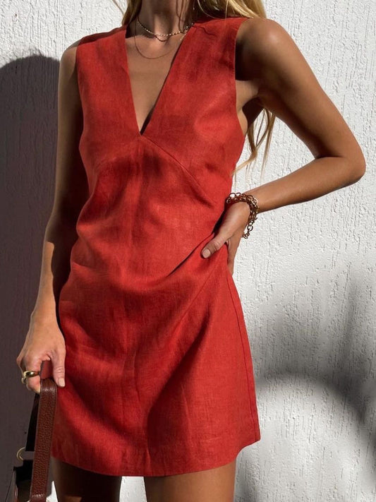 Syra Keten V Yaka Kısa Elbise
