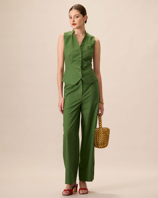 Yeşil Yüksek Bel Pamuklu Keten Bol Paça Pantolon