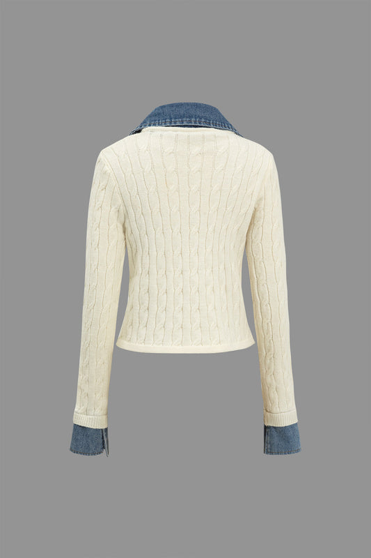 Örgü Denim Gömlek Yaka Uzun Kollu Üst