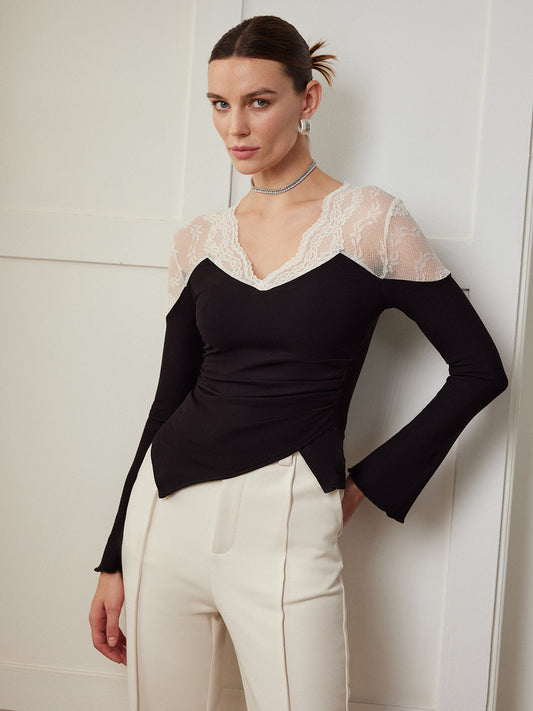 Zarif Dantel Panelli Şık Asimetrik Dar Bluz