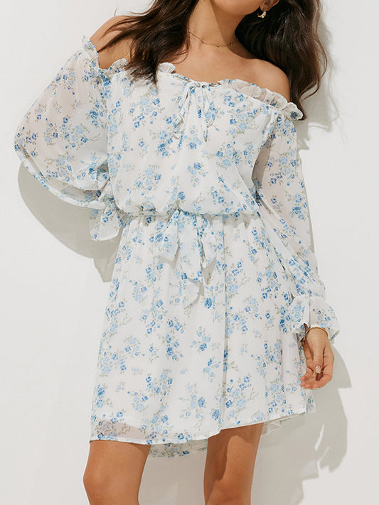 Çiçek Desenli Marul Kesimli Kemerli Omuzları Açık Kısa Elbise
