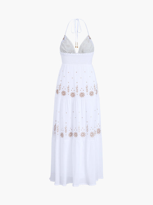 Nakış Düğümlü Boyundan Bağlamalı Uzun Elbise