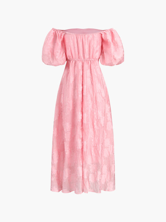 Dokulu Kumaştan Puf Kısa Kol Midi Elbise