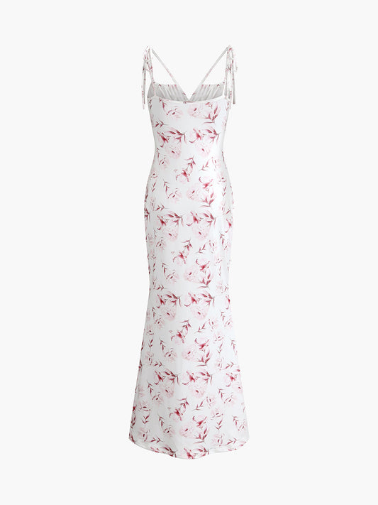Askılı Çiçek Desenli Düğümlü Dökümlü Uzun Sundress