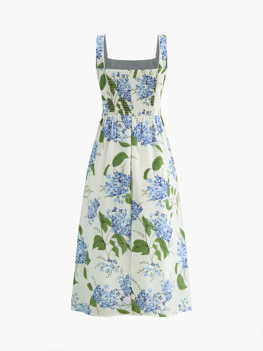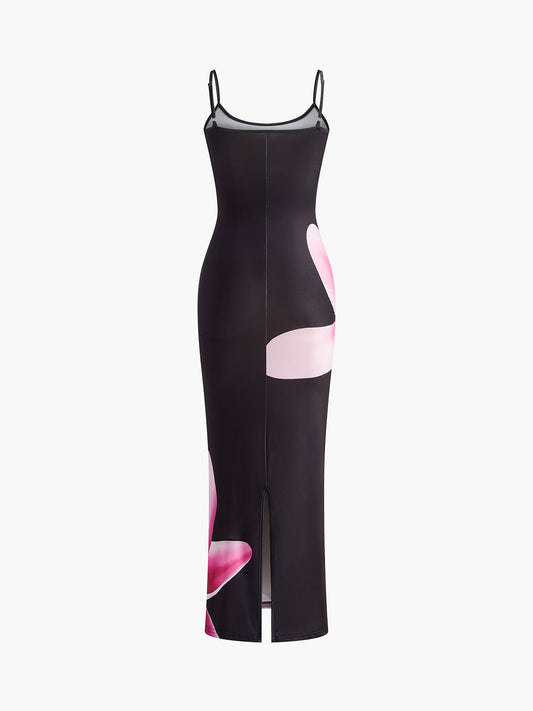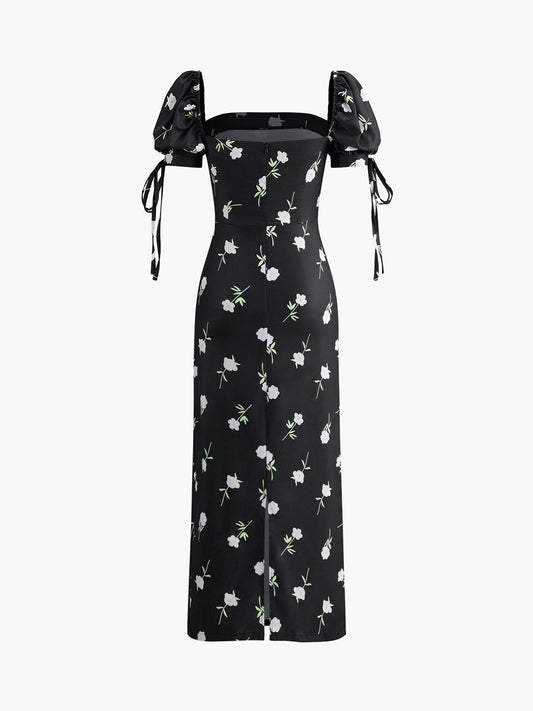 Çiçek Desenli Kare Yaka Yırtmaçlı İnce Elbise