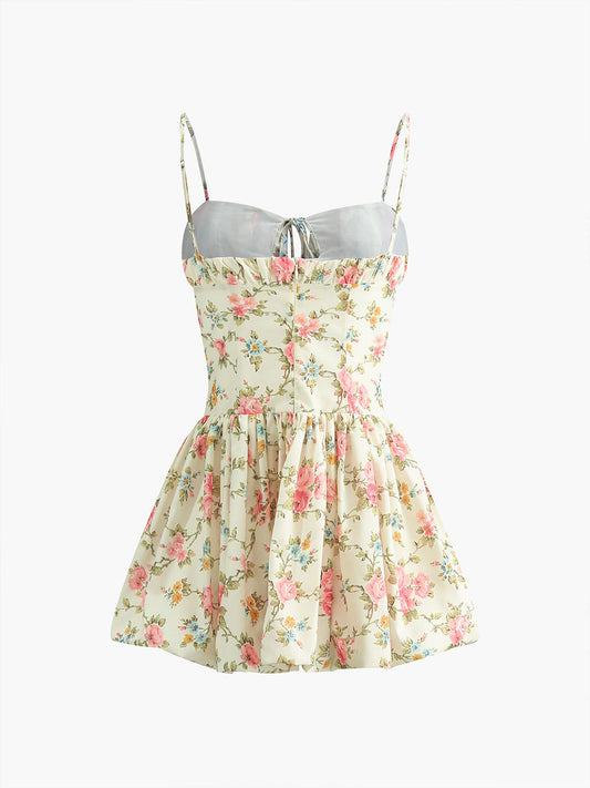 Çiçek Desenli Büzgülü Sırt Fırfırlı Düğümlü Kısa Elbise