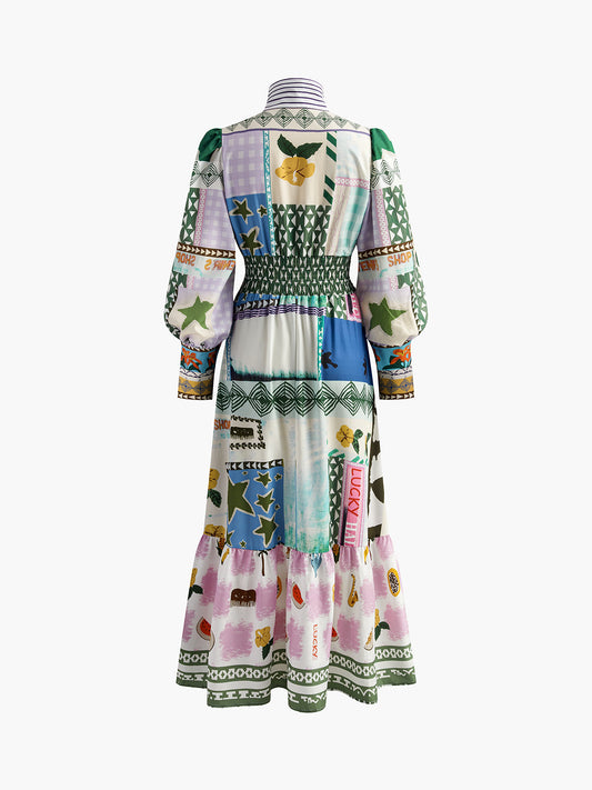 Baskılı Dik Yaka Büzgülü Elbise