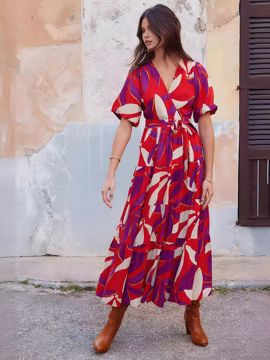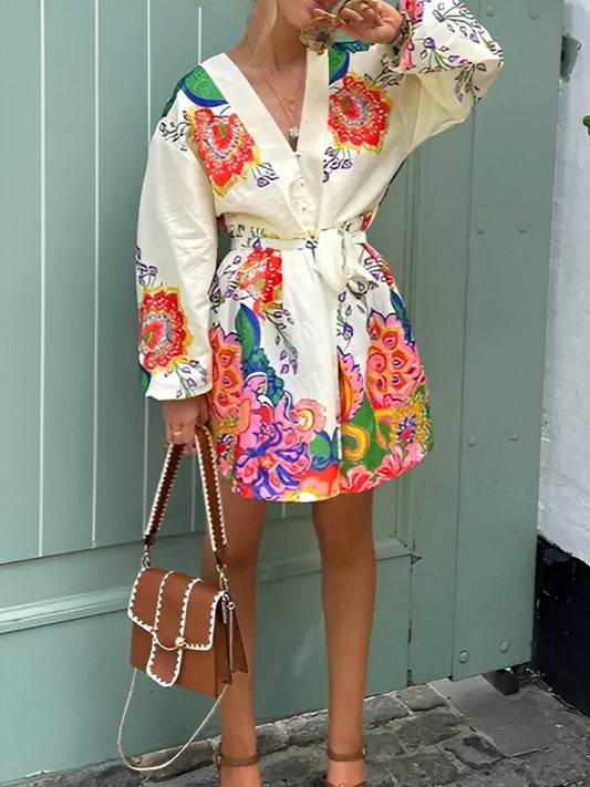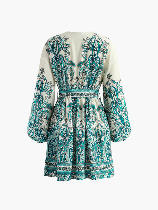 Baskılı V Yaka Fener Kollu Kısa Elbise