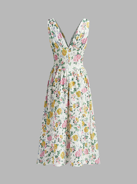 Vintage Çiçekli Bağcıklı Bodycon Elbise