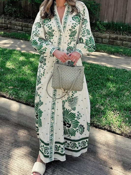 Vintage Baskılı Düğmeli Uzun Elbise