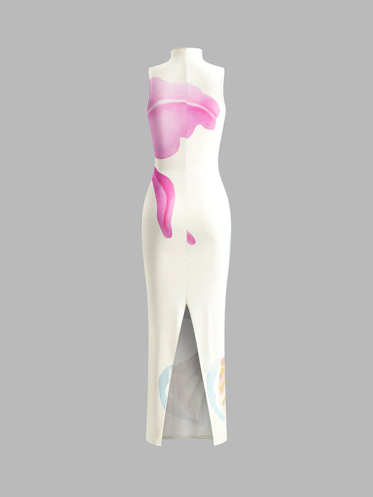 Romantik Baskılı Yırtmaçlı Tüp Elbise