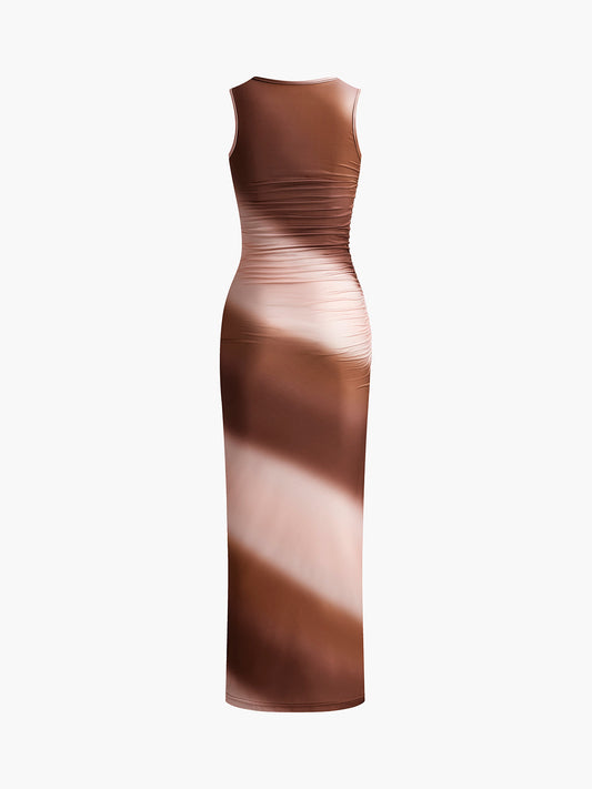 Baskılı V Yaka Kolsuz Uzun Elbise