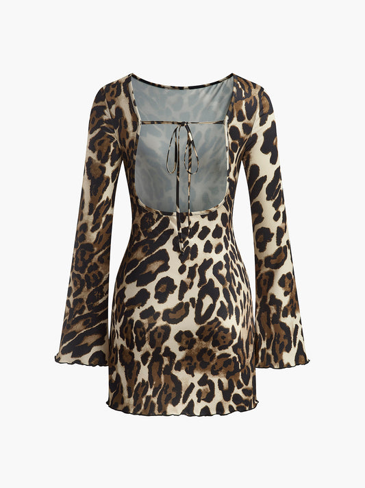 Leopar Baskılı Sırtı Açık Kravatlı Elbise