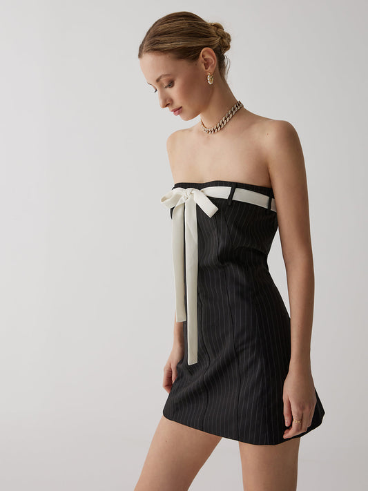 Çizgili Beyaz Fiyonklu Kısa Elbise