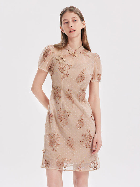 Bej Renkli Nakışlı Çiongşam Qipao Mini Elbise