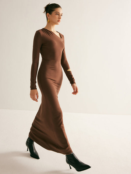 Yüksek Yaka Asimetrik Pliseli Uzun Elbise