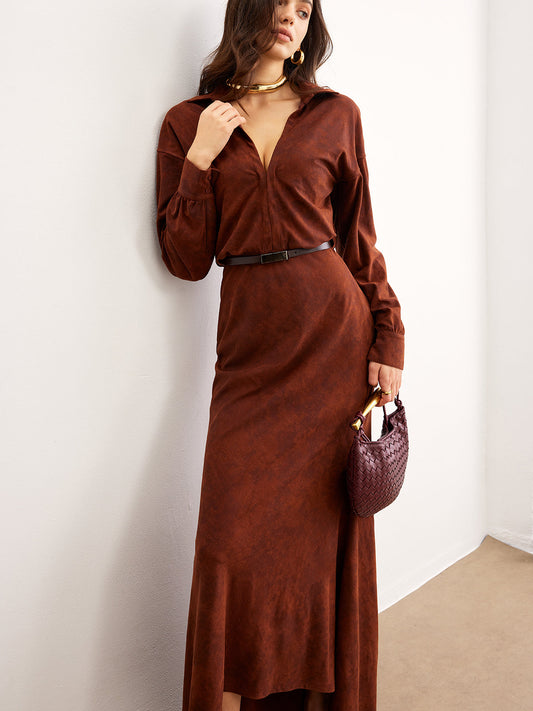 Metal Düğmeli Kuşaklı Kadife Elbise