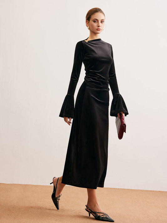 Metal Aksanlı Split Pliseli Uzun Elbise