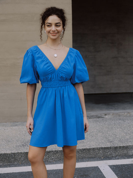 Pamuklu Puf Kol Düğümlü V Yaka Kısa Elbise