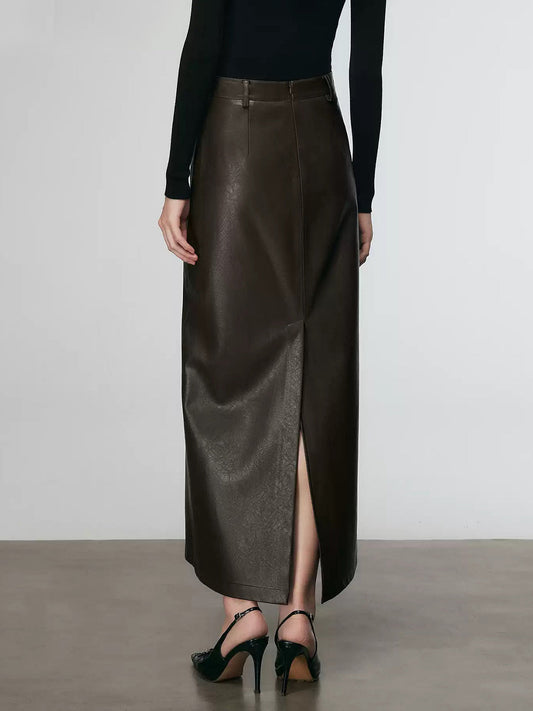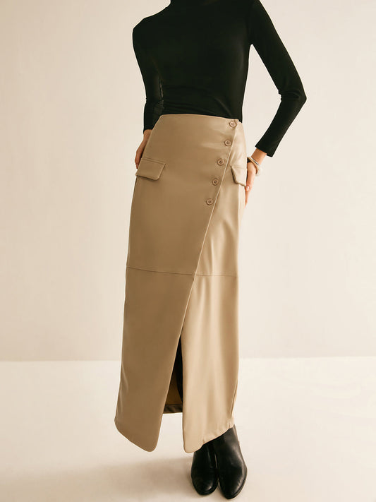 Plise Detaylı Yırtmaçlı PU Deri Etek