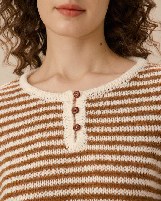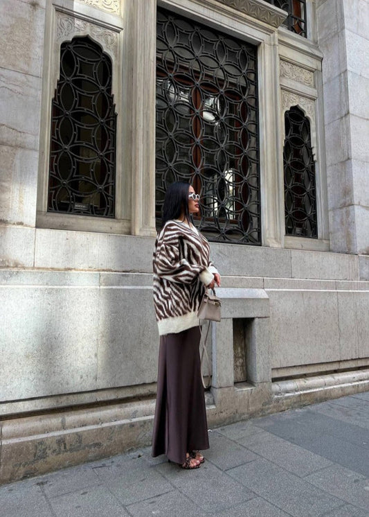 Kahverengi Çizgili Düşük Omuzlu Kazak