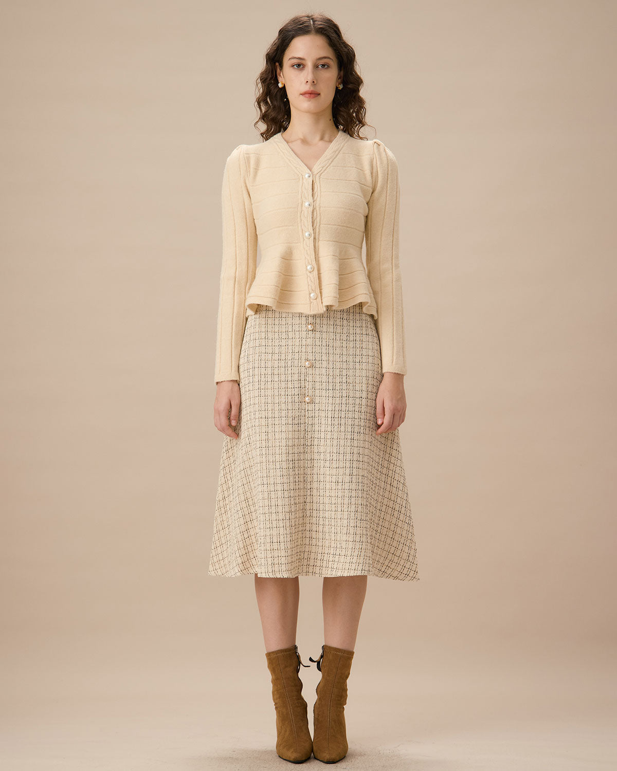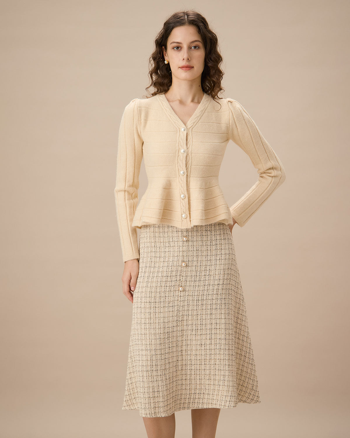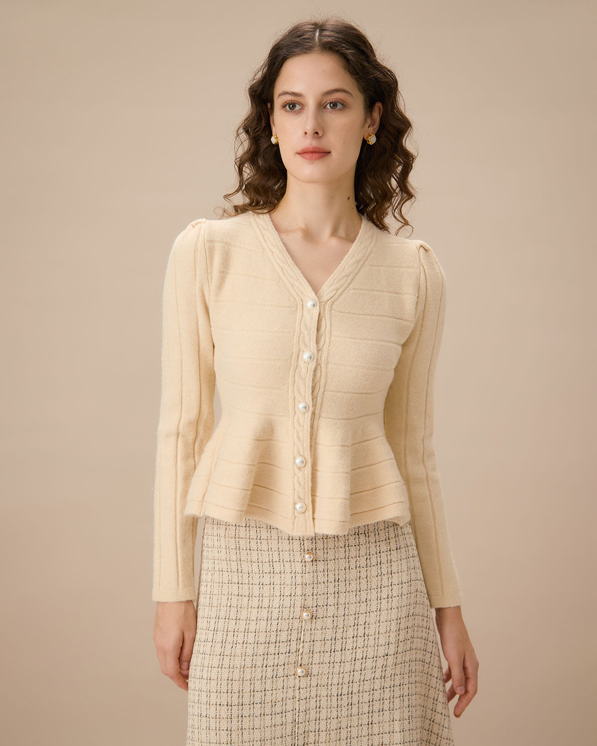 Bej Rengi V Yaka Tek Düğmeli Çizgili Hırka