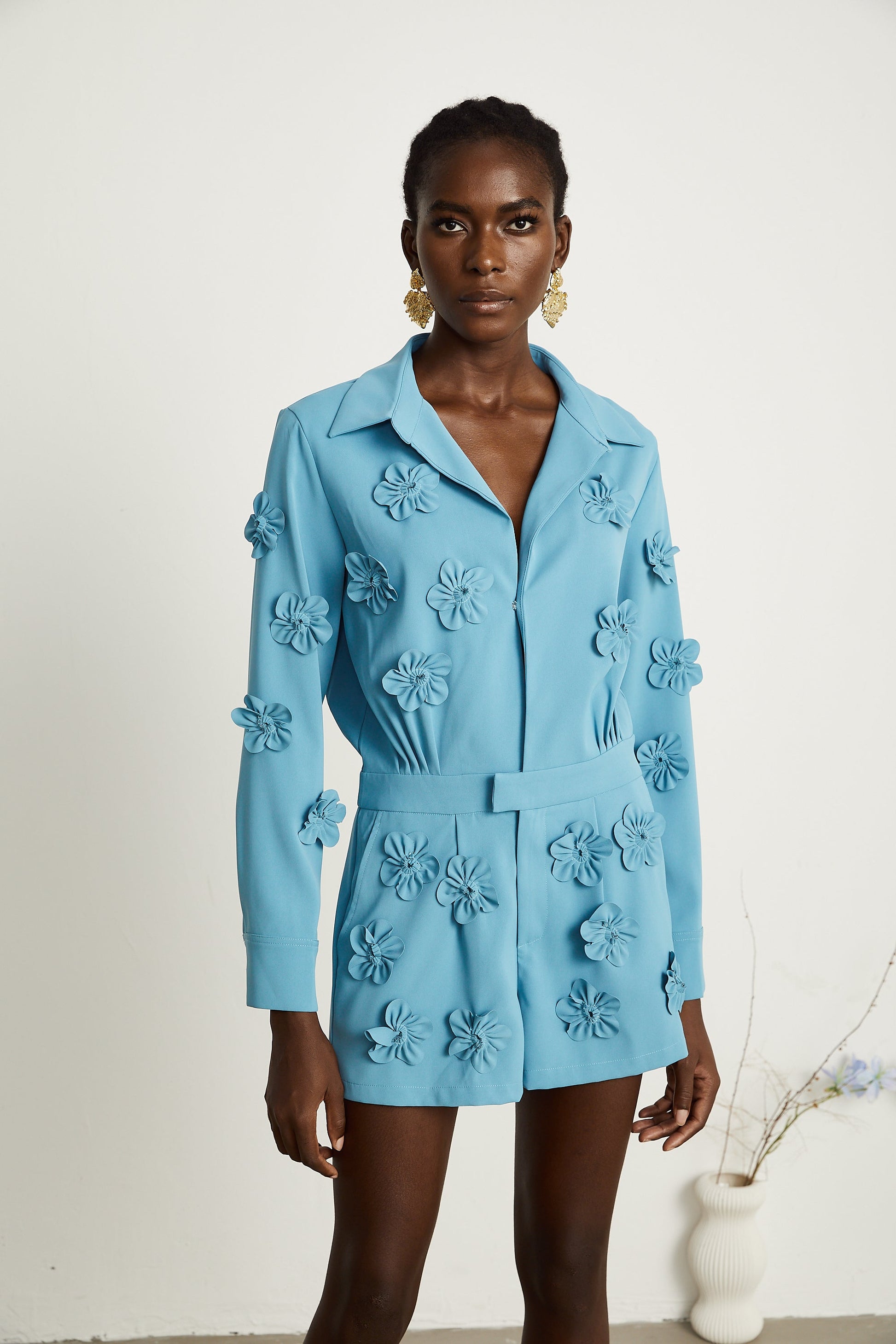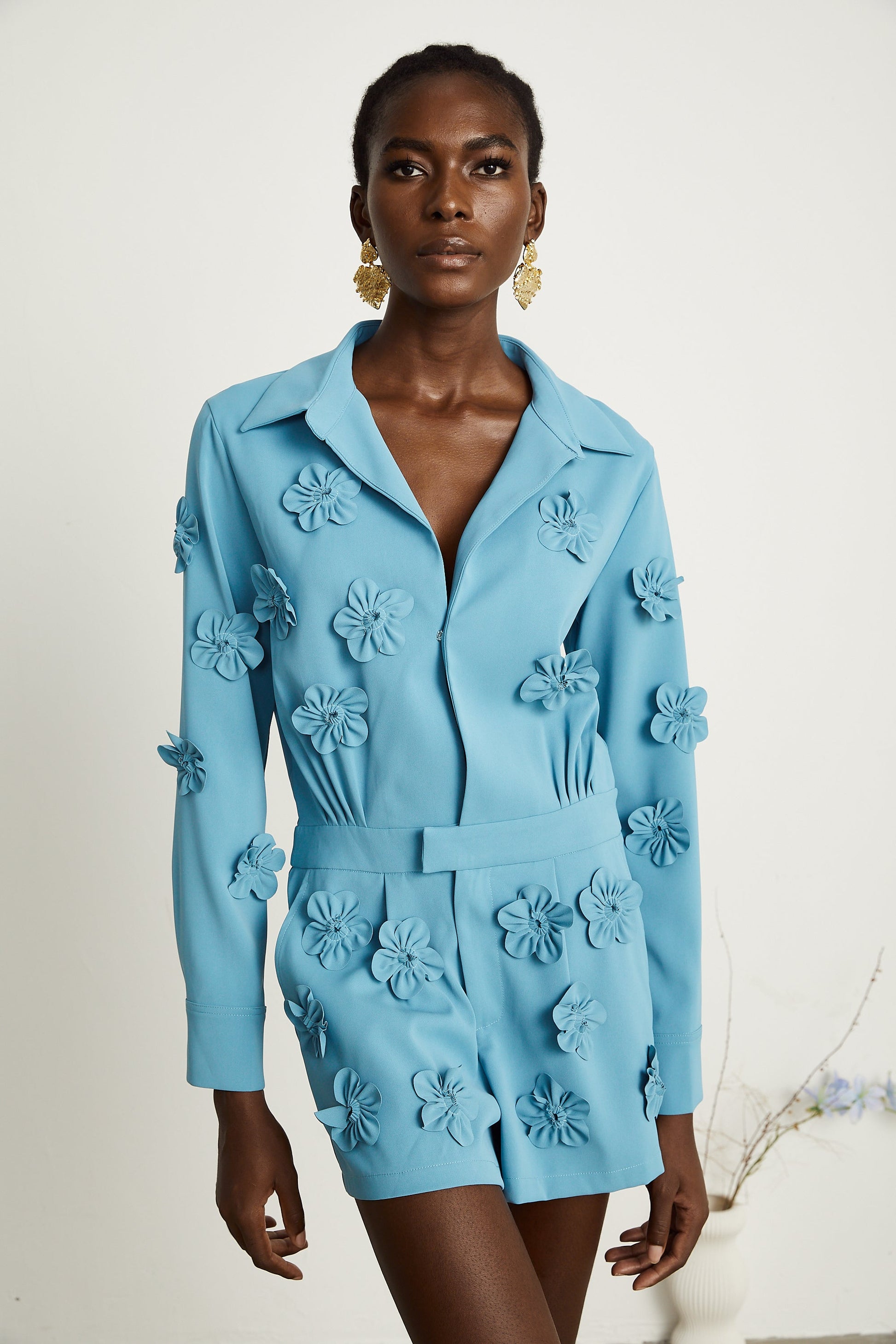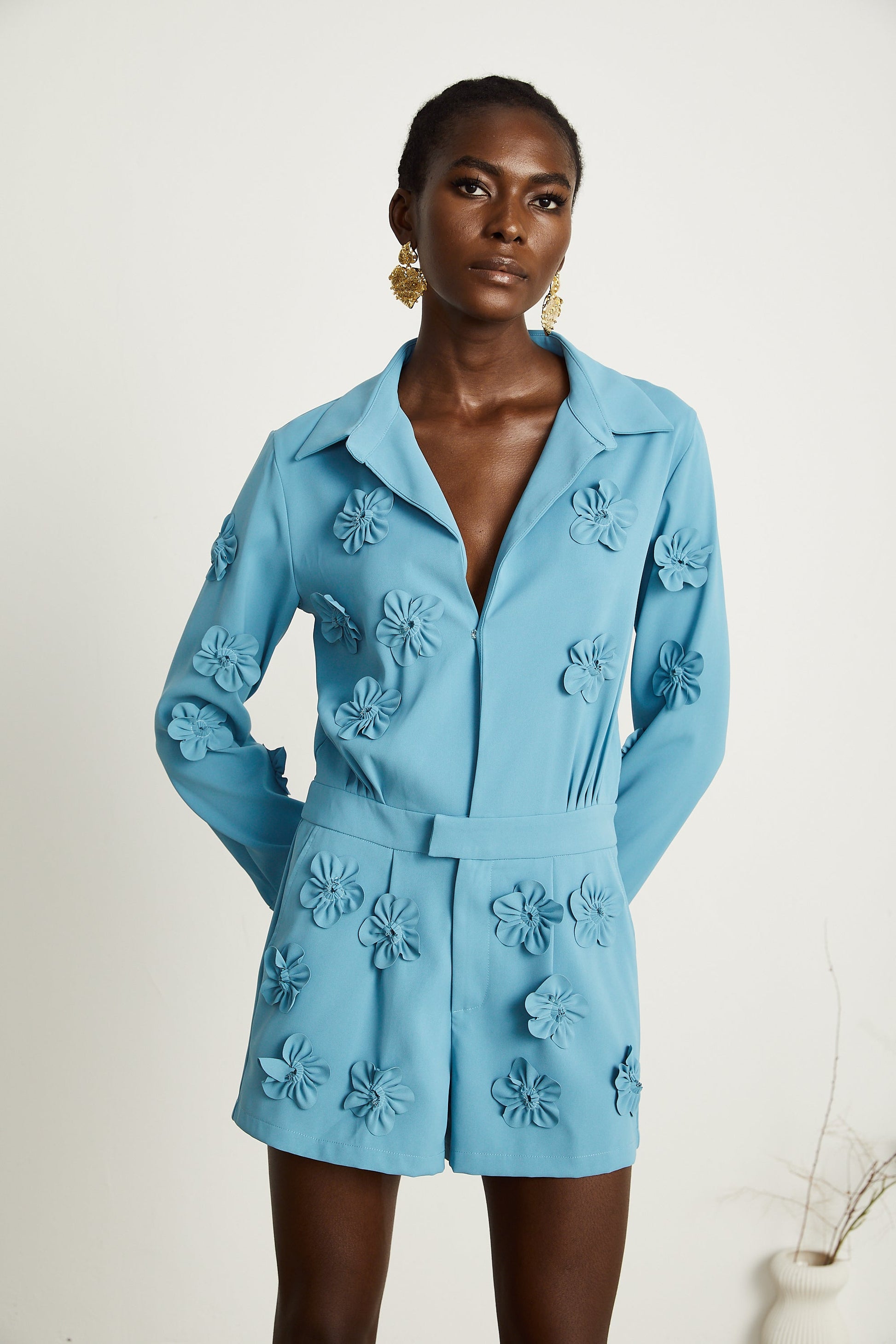 Béatrix Mavi Çiçek Aplikeli Tulum