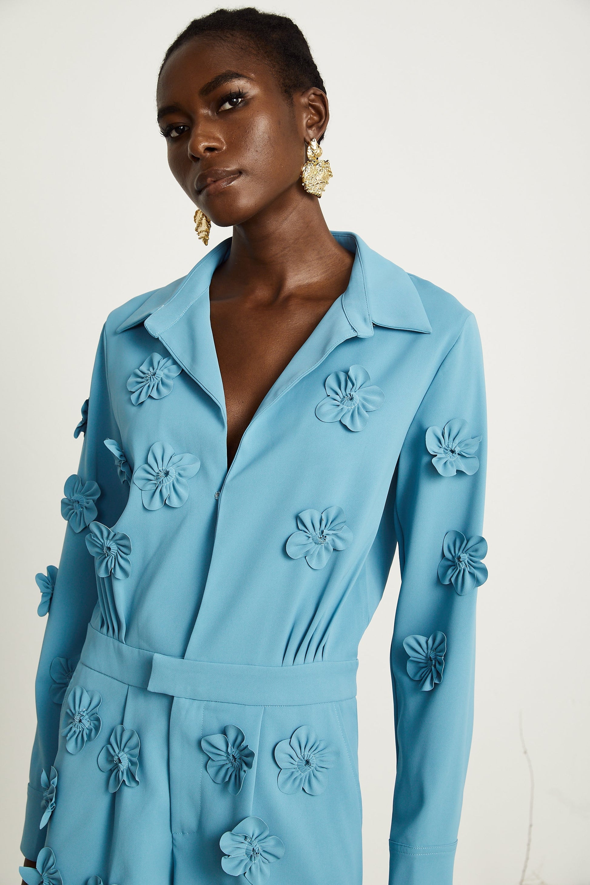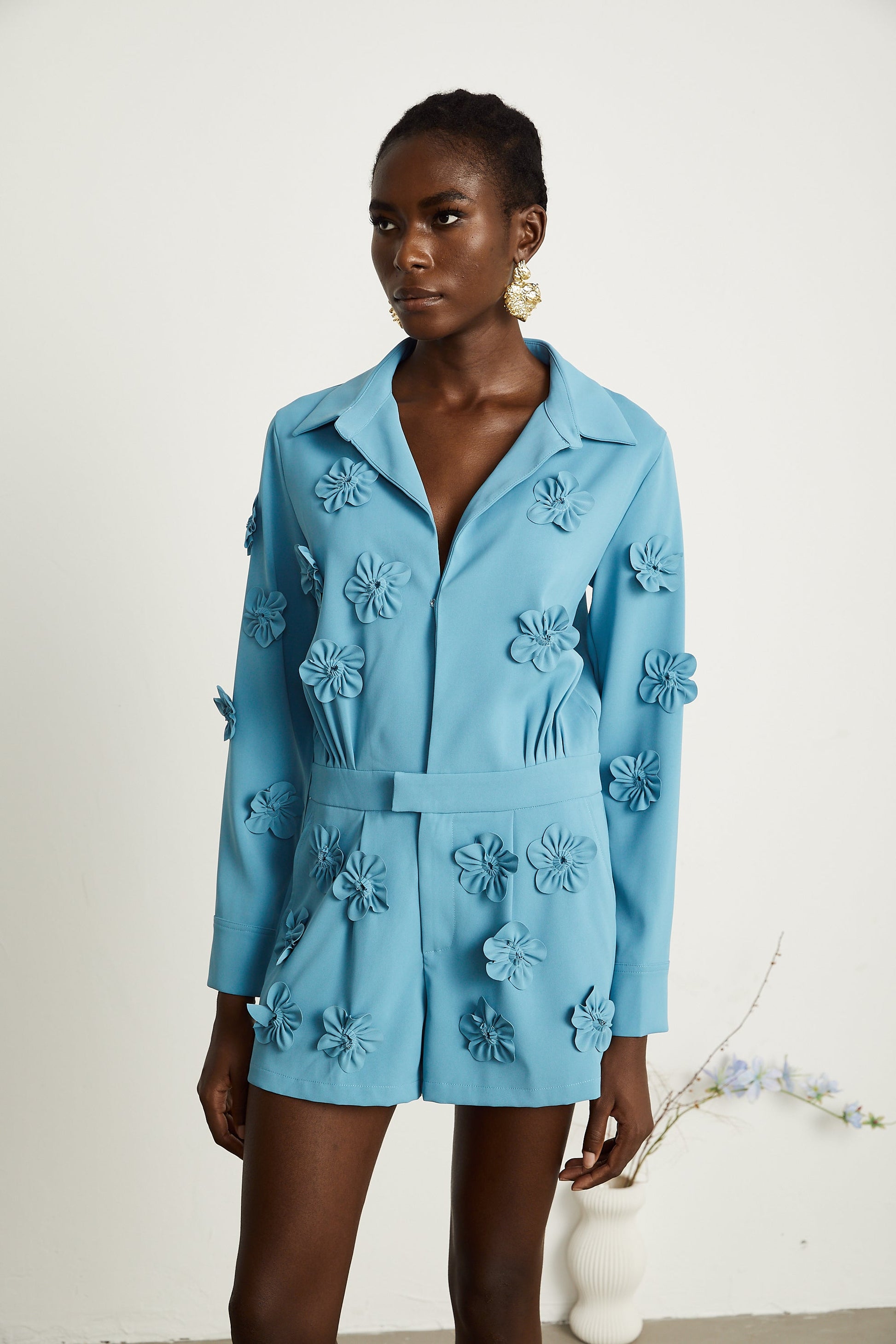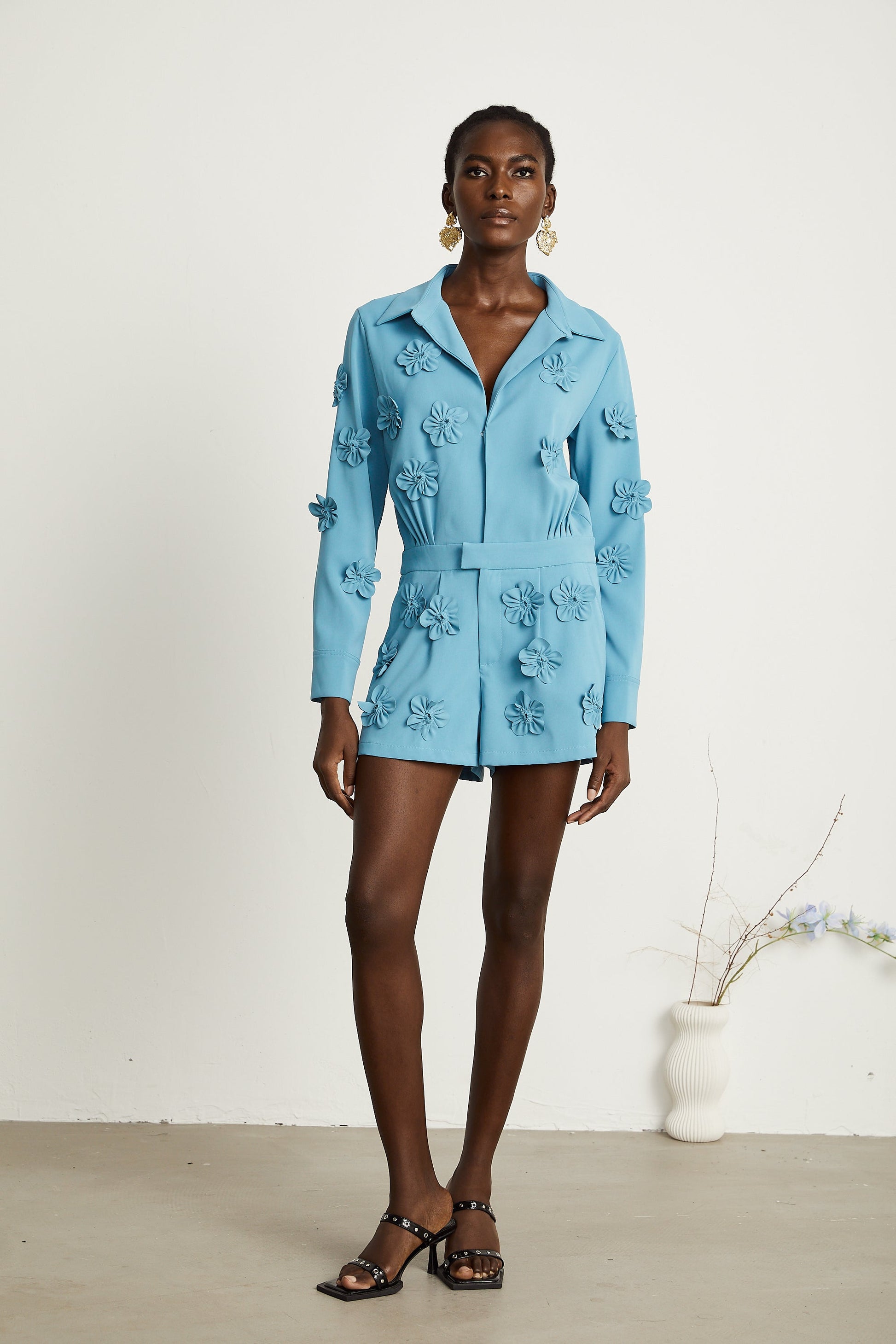 Béatrix Mavi Çiçek Aplikeli Tulum