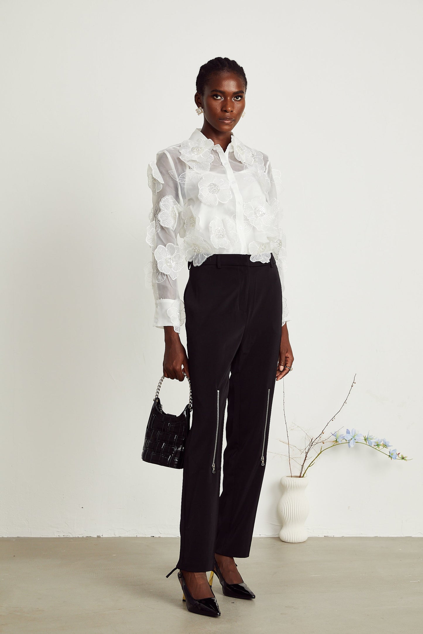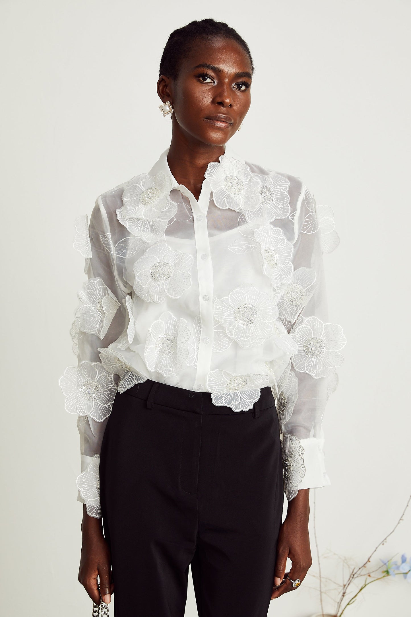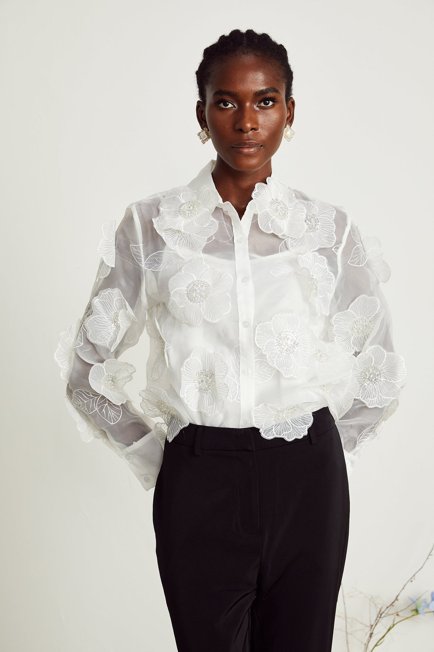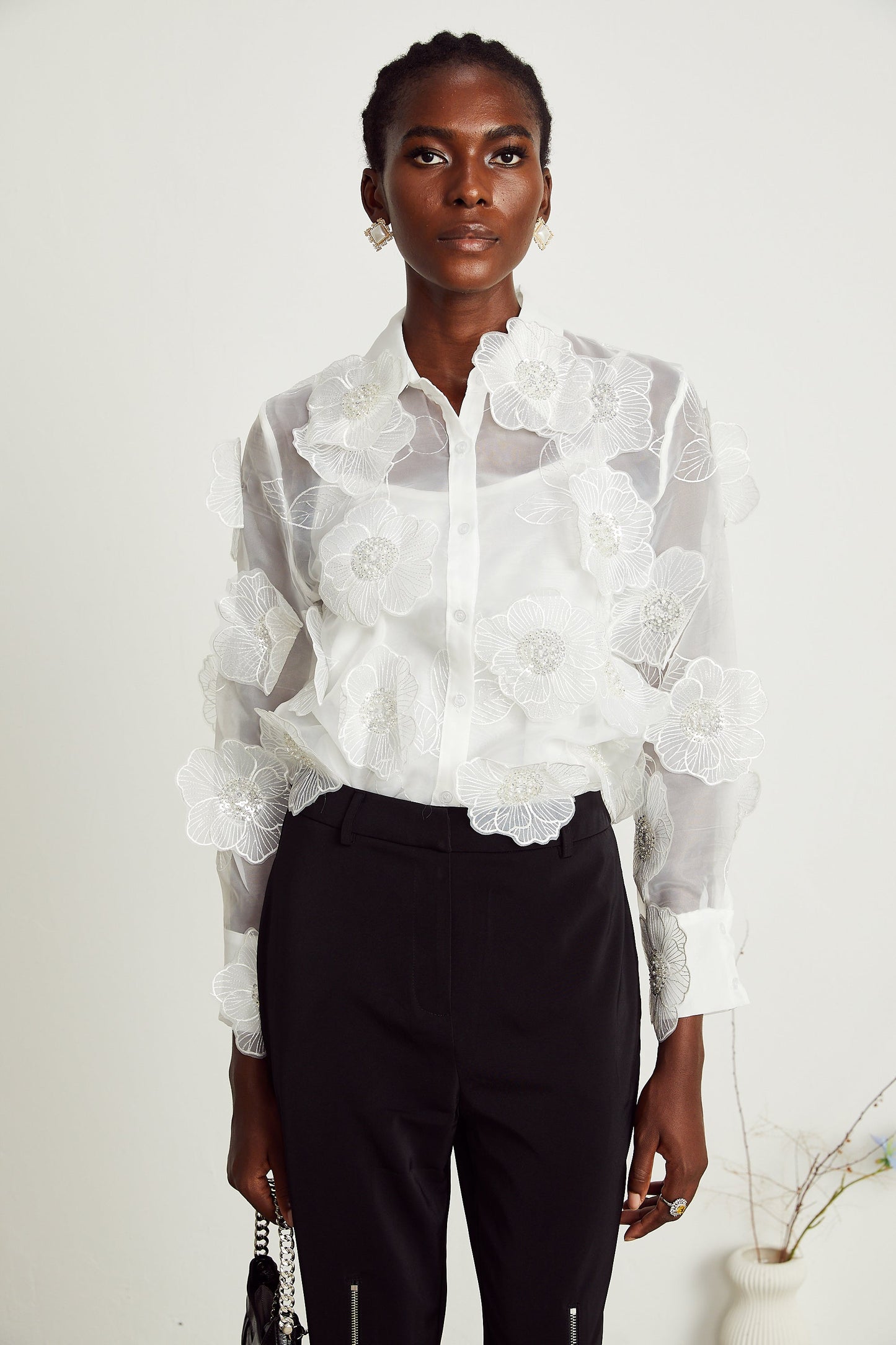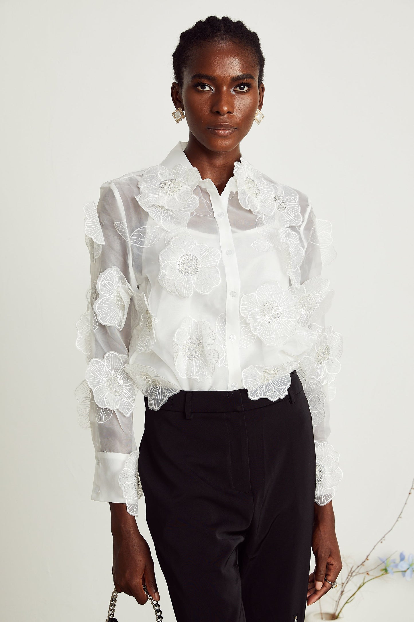 Béatrix Beyaz Süslemeli Transparan Gömlek