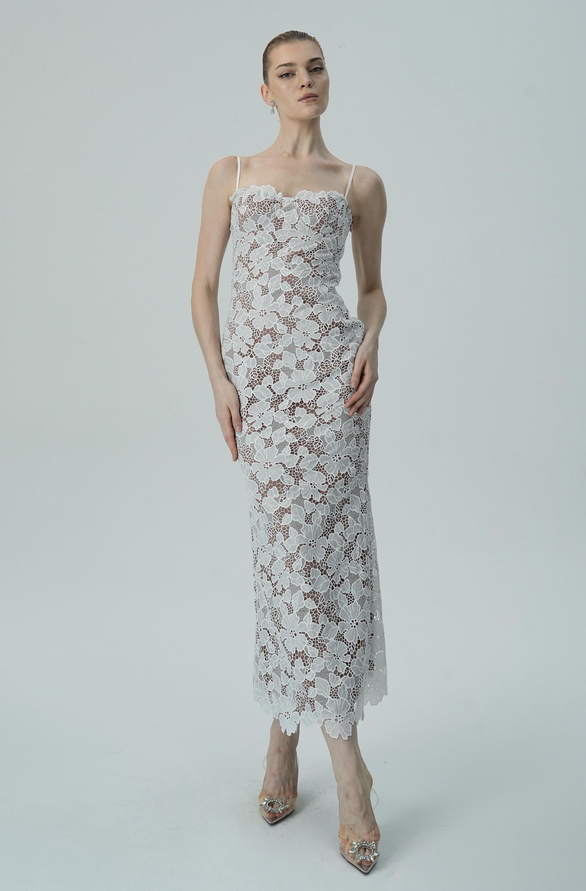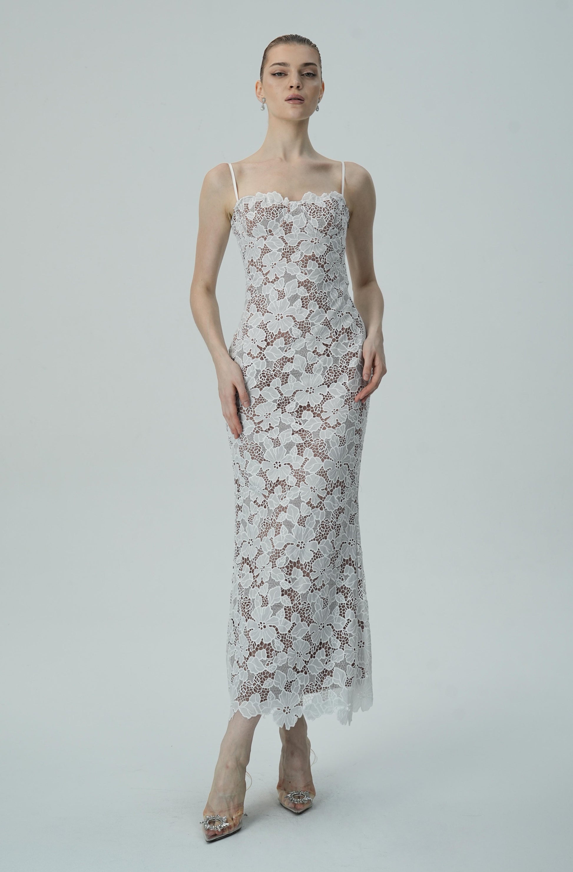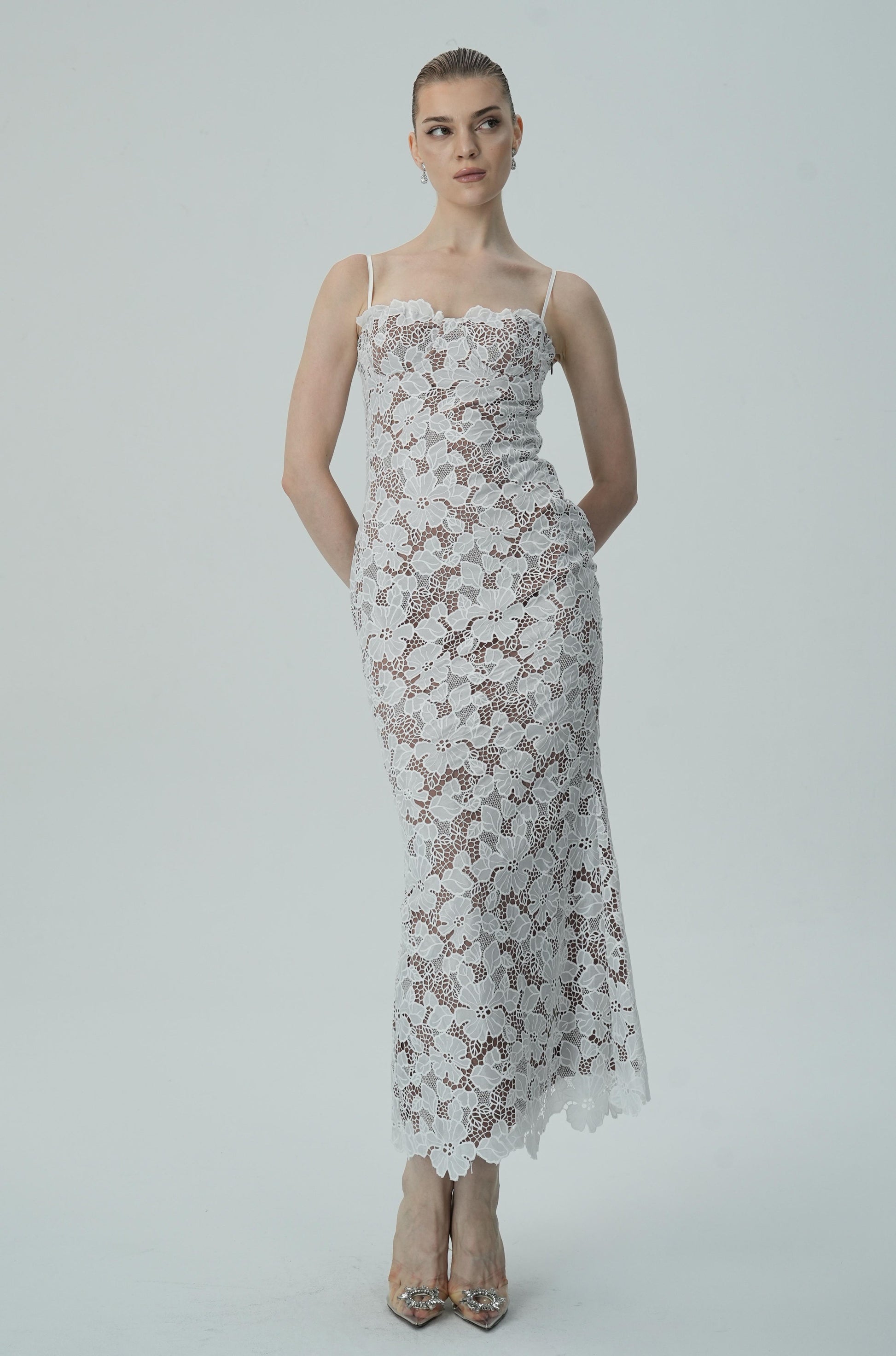 Bu şık ve romantik dantel elbise, ince çiçek dantel işlemeleri, spagetti askıları ve vücuda oturan kesimiyle sofistike bir görünüm sunuyor. Tam boy tasarımı, zarif ve akıcı bir duruş sağlarken, zamansız beyaz rengi elbiseye klasik ve asil bir hava katıyor. Özel davetler ve resmi etkinlikler için mükemmel bir seçim!
