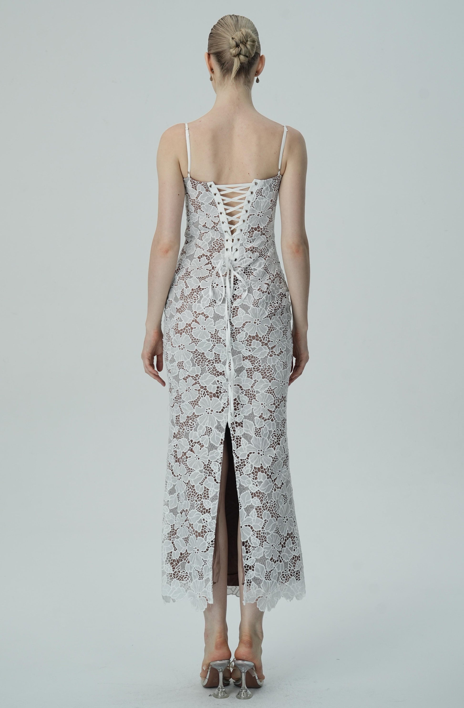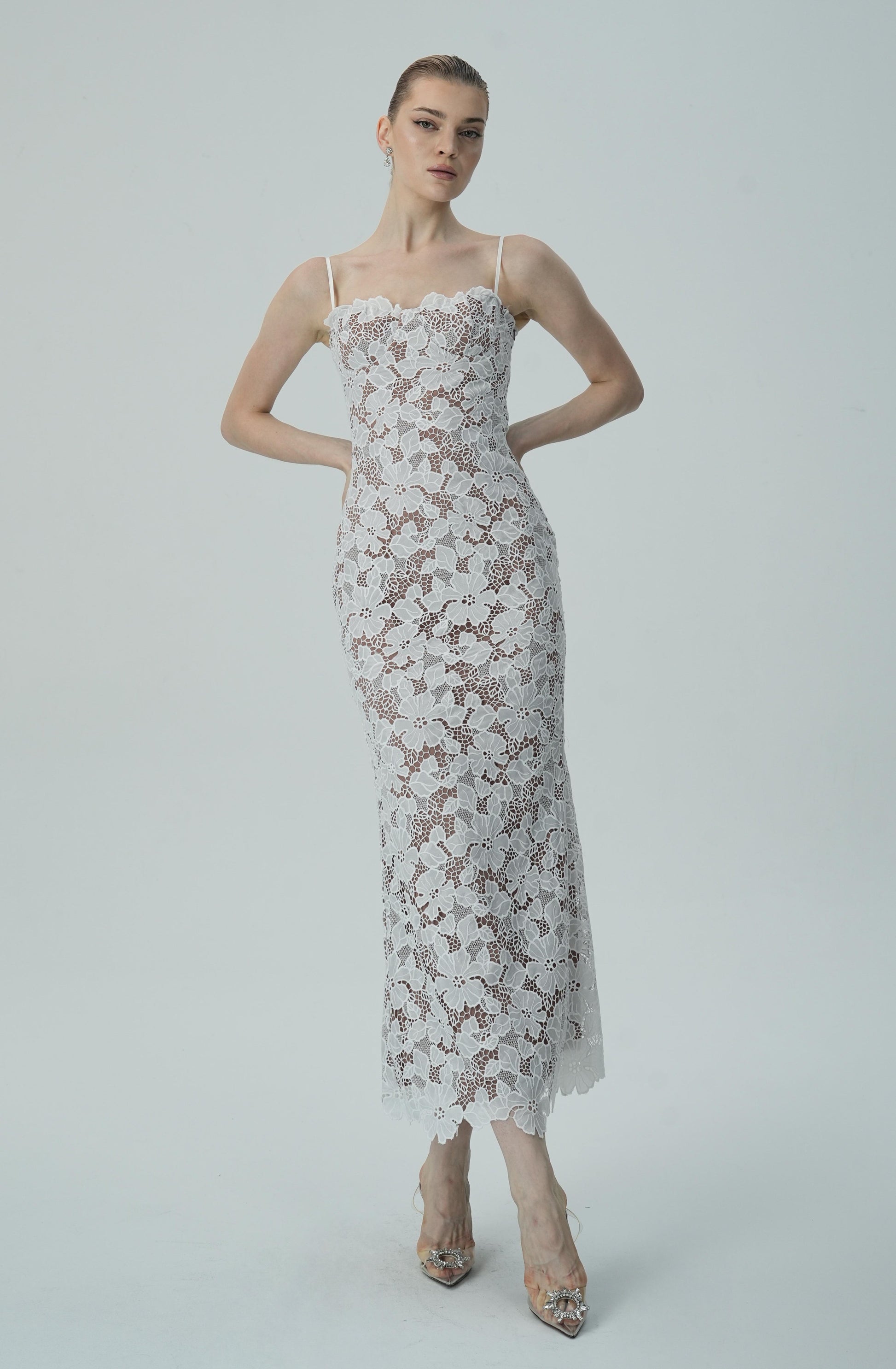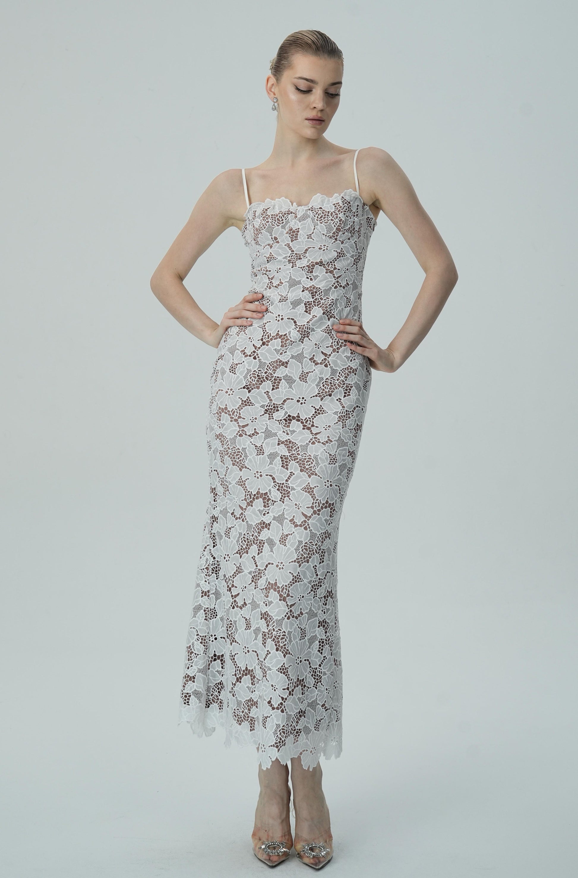 Bu şık ve romantik dantel elbise, ince çiçek dantel işlemeleri, spagetti askıları ve vücuda oturan kesimiyle sofistike bir görünüm sunuyor. Tam boy tasarımı, zarif ve akıcı bir duruş sağlarken, zamansız beyaz rengi elbiseye klasik ve asil bir hava katıyor. Özel davetler ve resmi etkinlikler için mükemmel bir seçim!