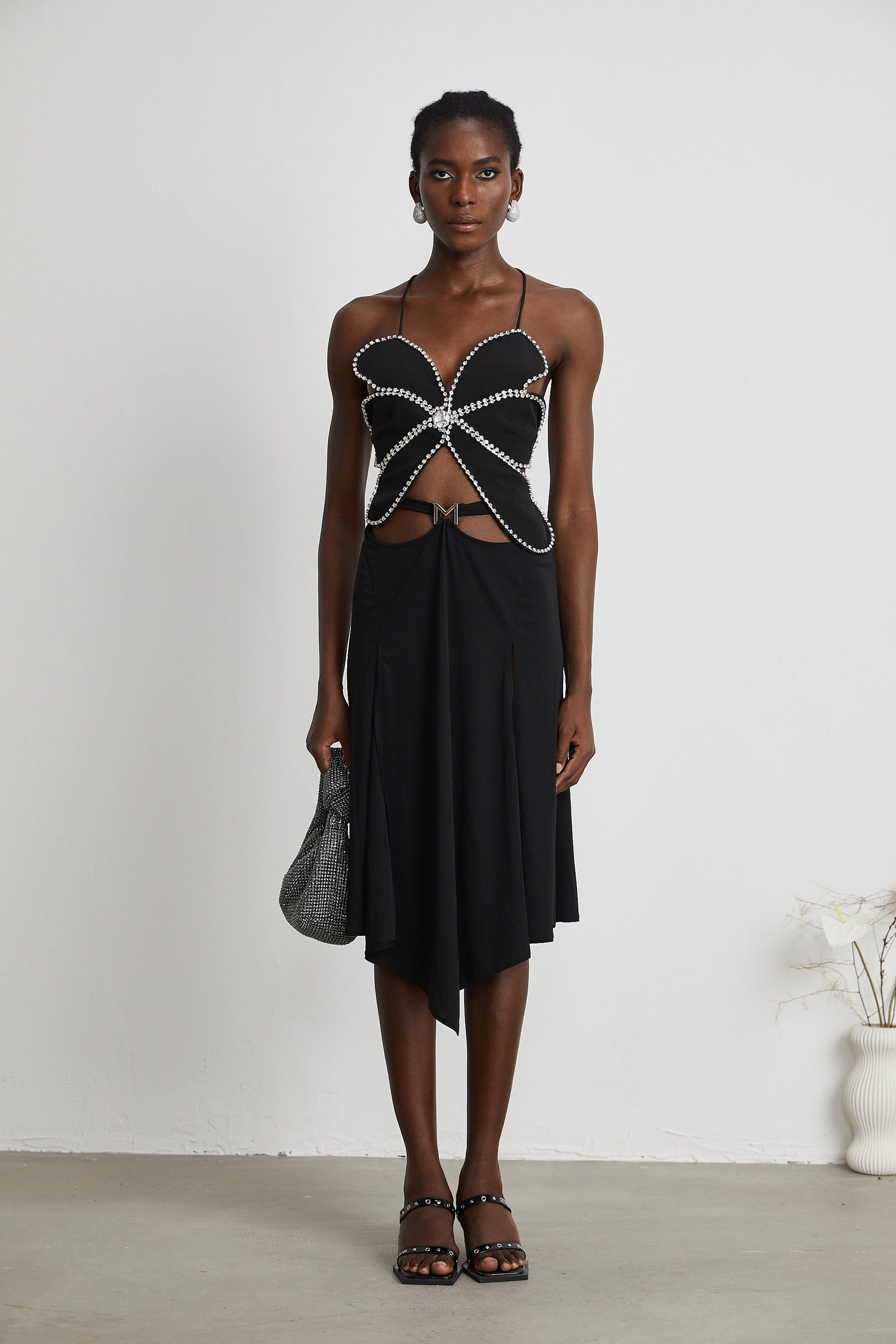 Inès Beyaz Kristal Süslemeli Midi Elbise