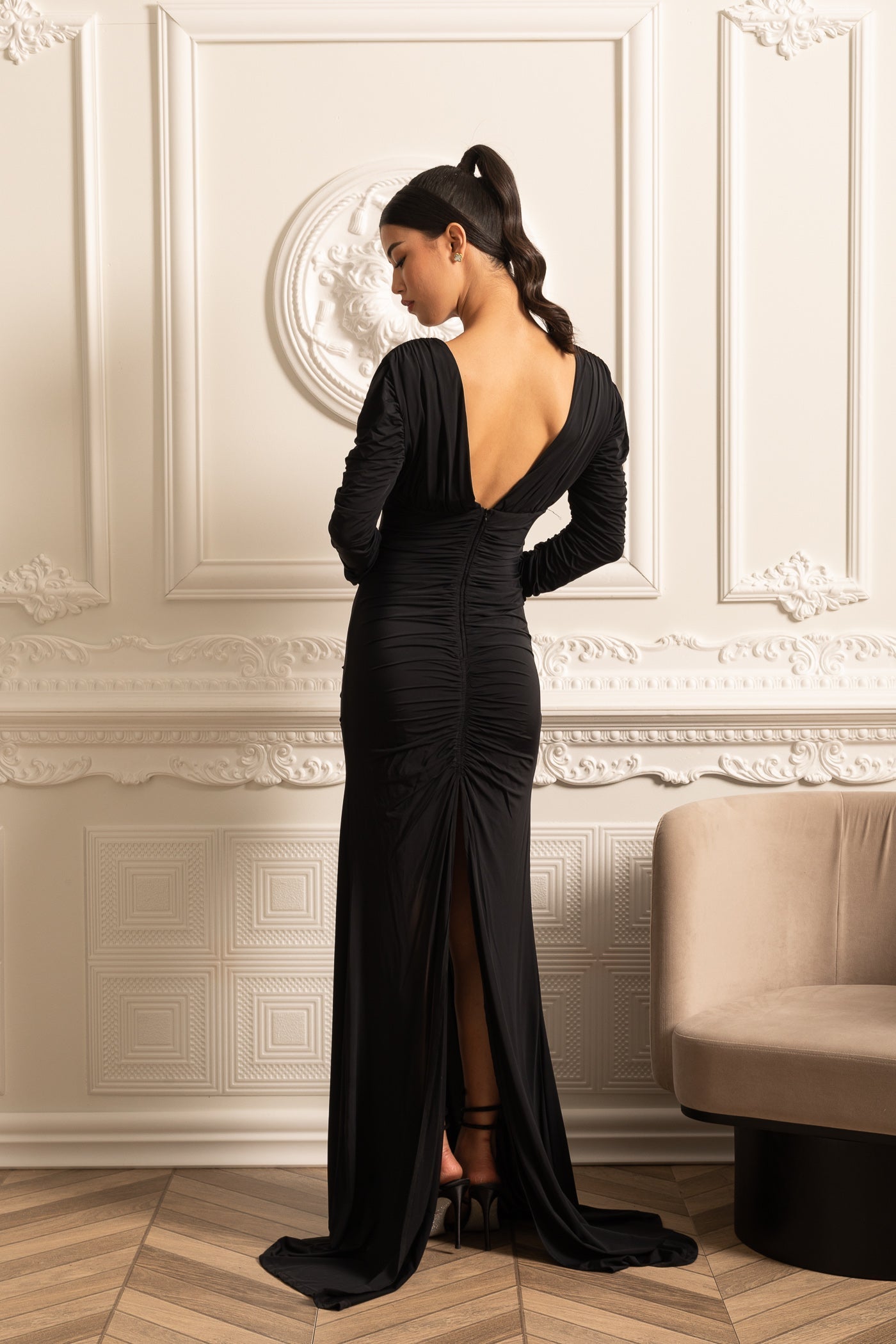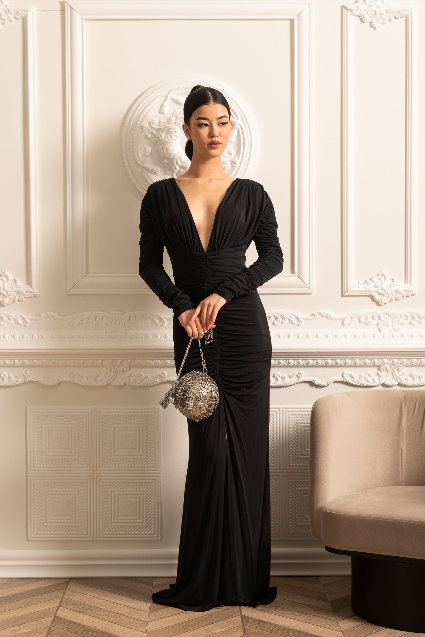 Zarafeti ön planda tutan bu siyah elbise, derin V yaka kesimi ve vücuda oturan silüetiyle şıklığı yeniden tanımlıyor. Tam boy kolları ve özenle yerleştirilmiş büzgü detayları sayesinde ince ve dengeli bir görünüm sunar. Dokulu ön tasarımı, klasik siyah rengi sofistike bir şekilde vurgular. Arka fermuarla kolayca giyilebilir. Özel davetler, akşam yemekleri ve şık organizasyonlar için etkileyici bir tercih!