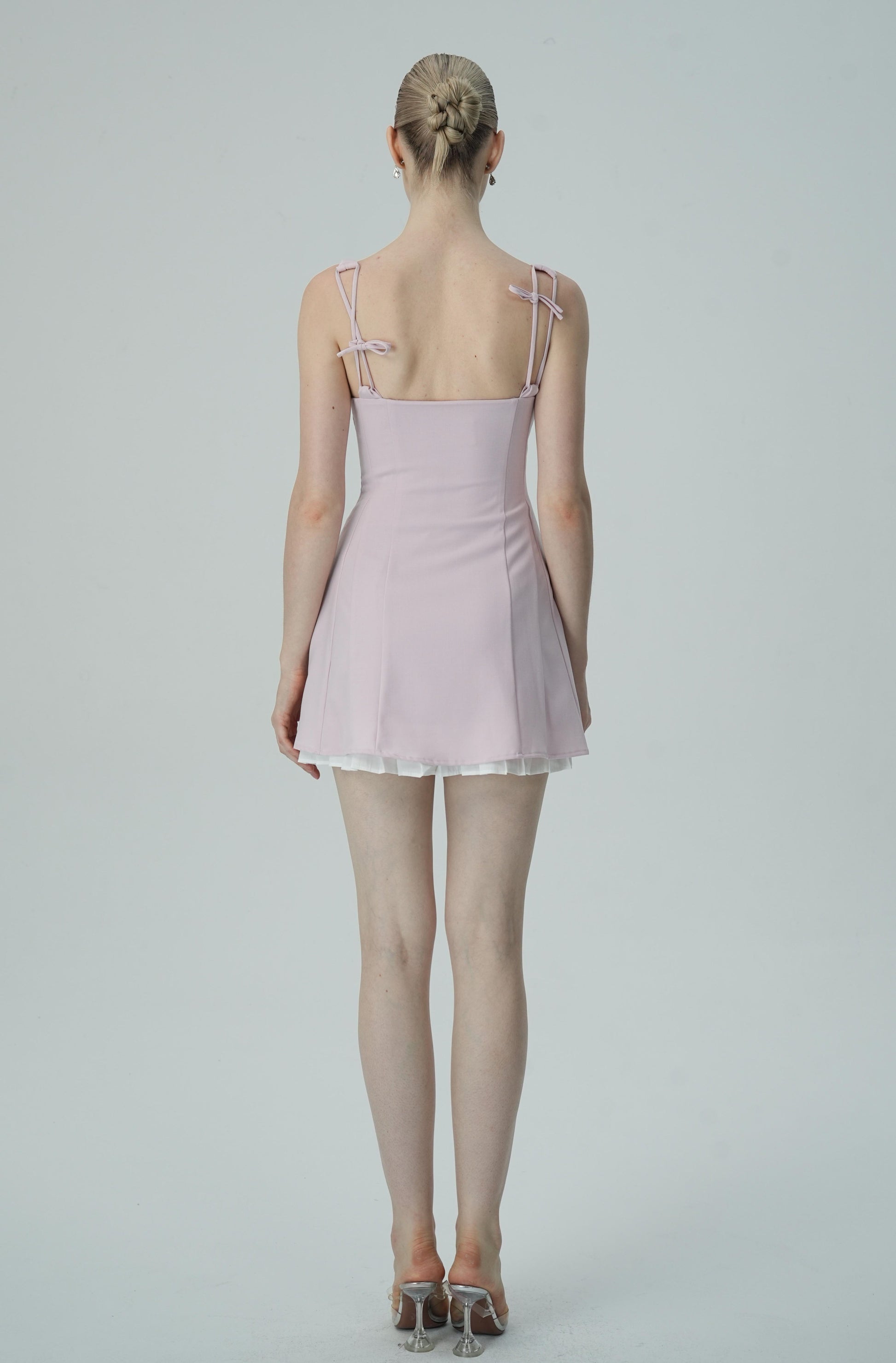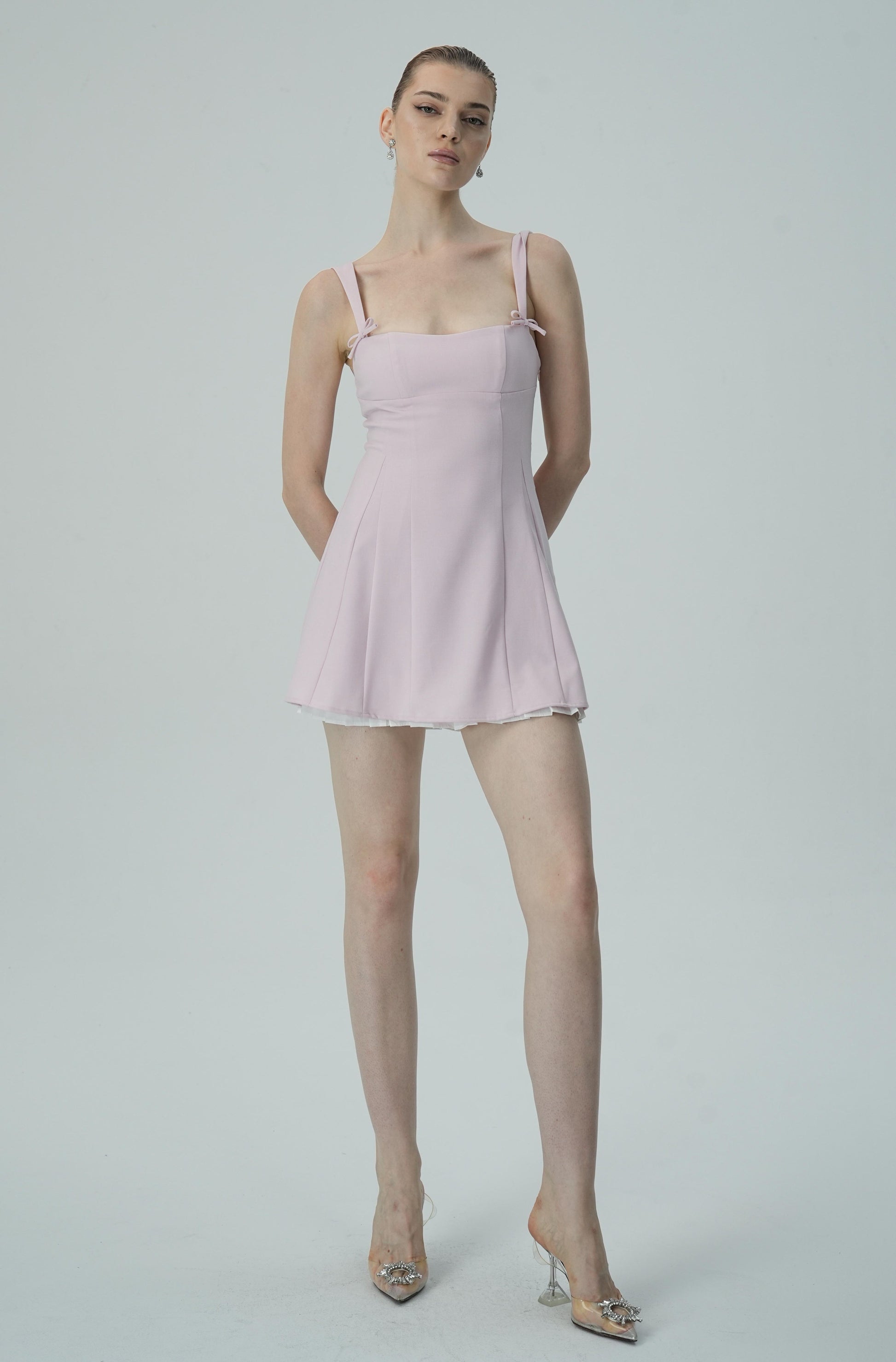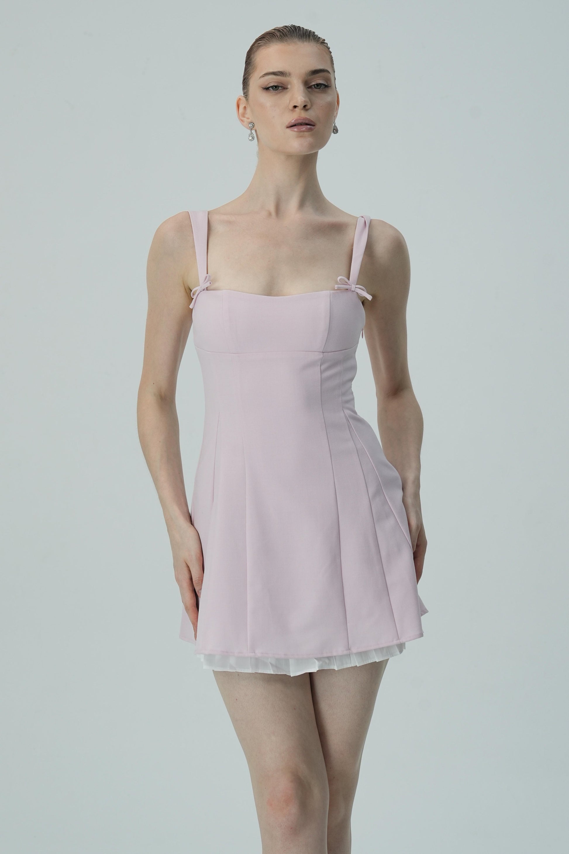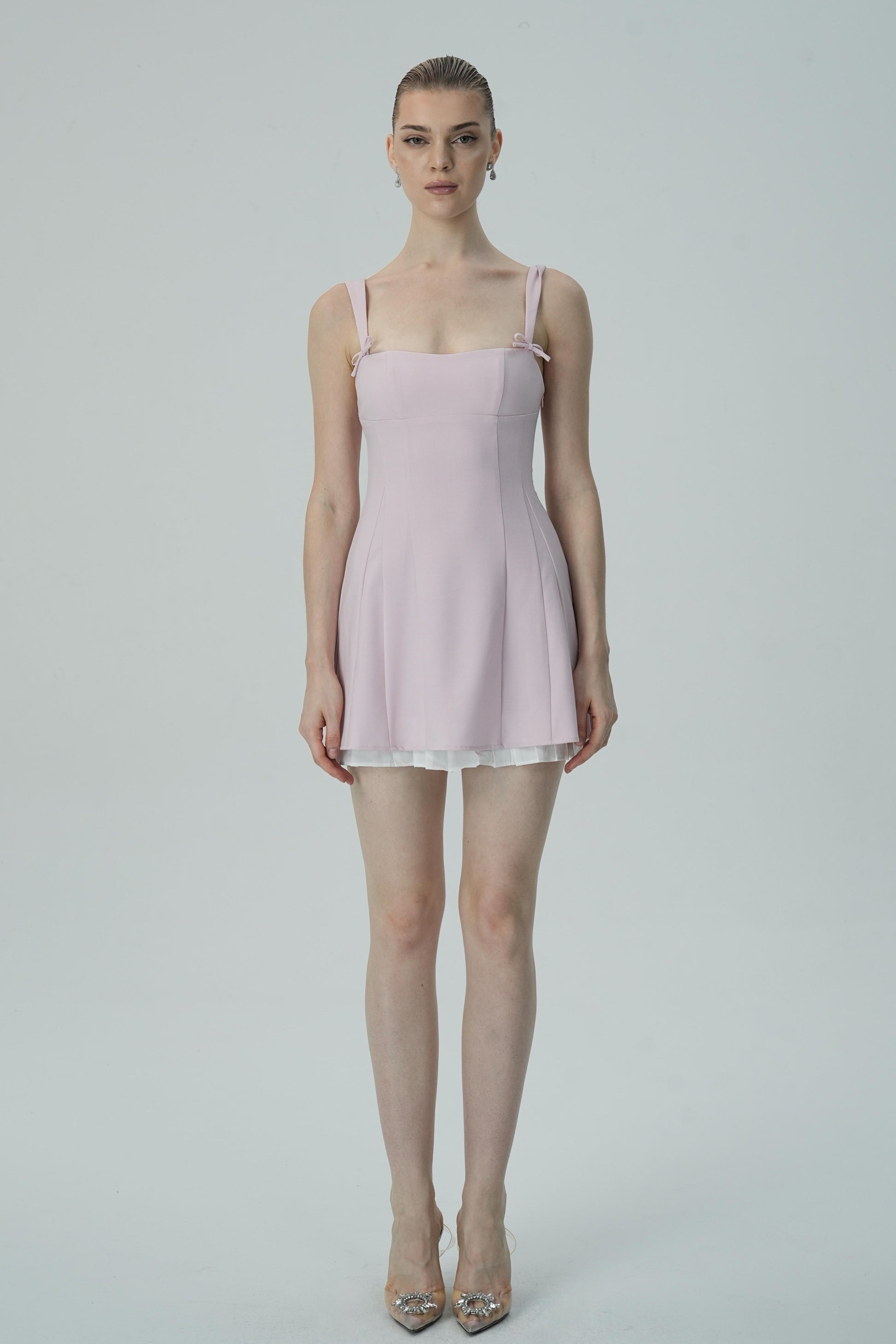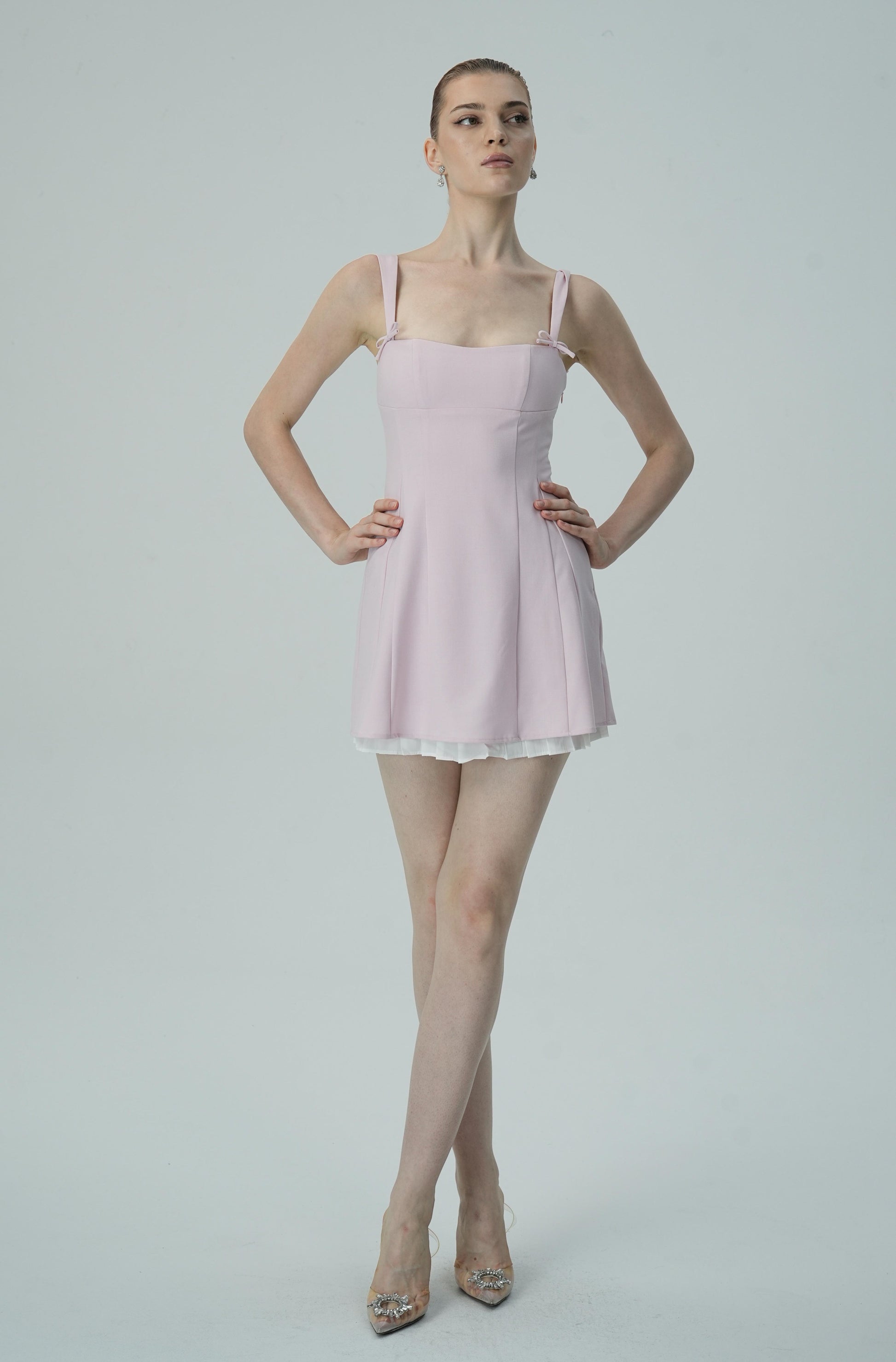 Fiyonk Askılı Yumuşak Pembe Mini Elbise