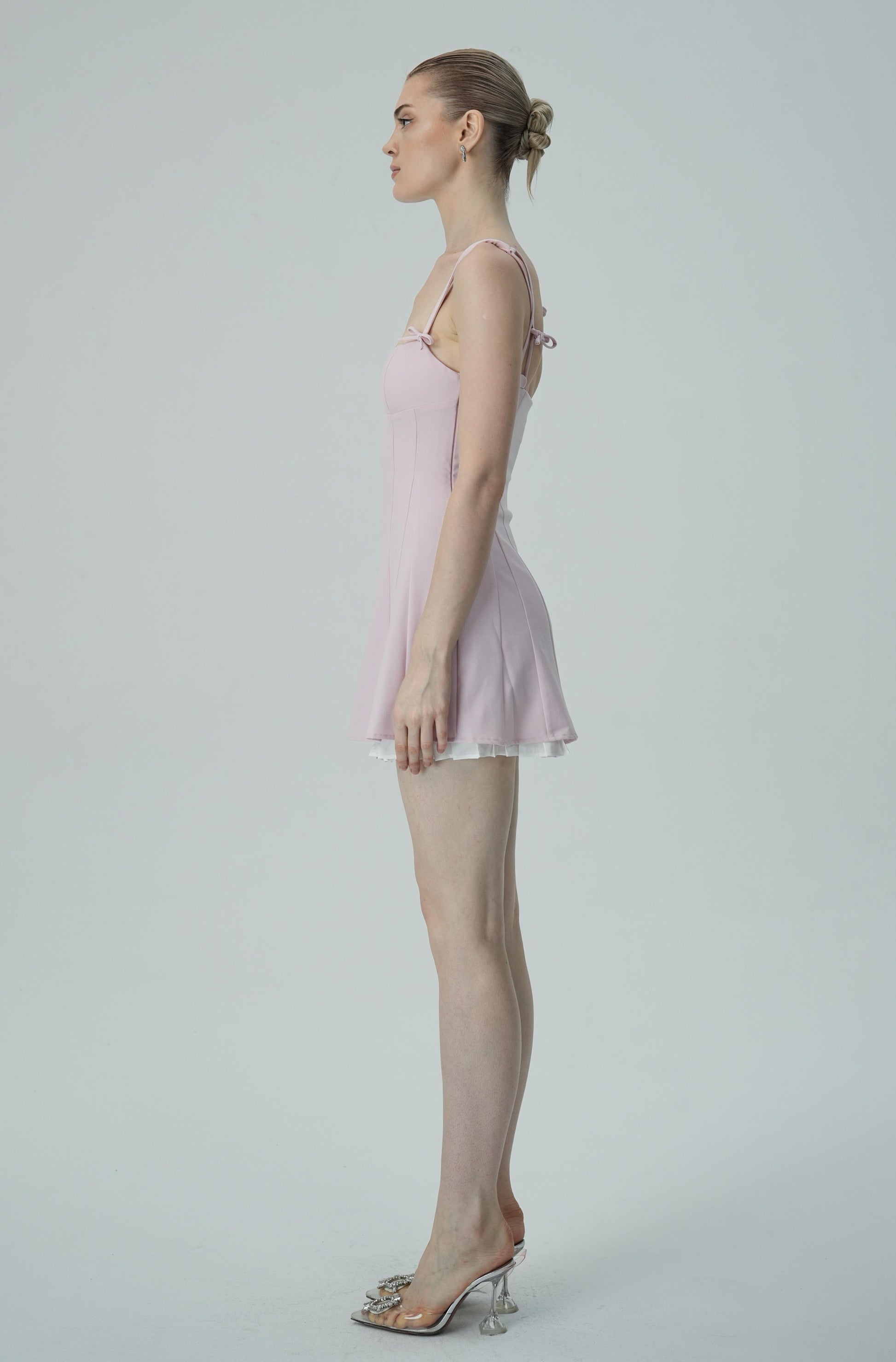 Pudra Pembe Fiyonklu Mini Elbise – Feminen ve Romantik