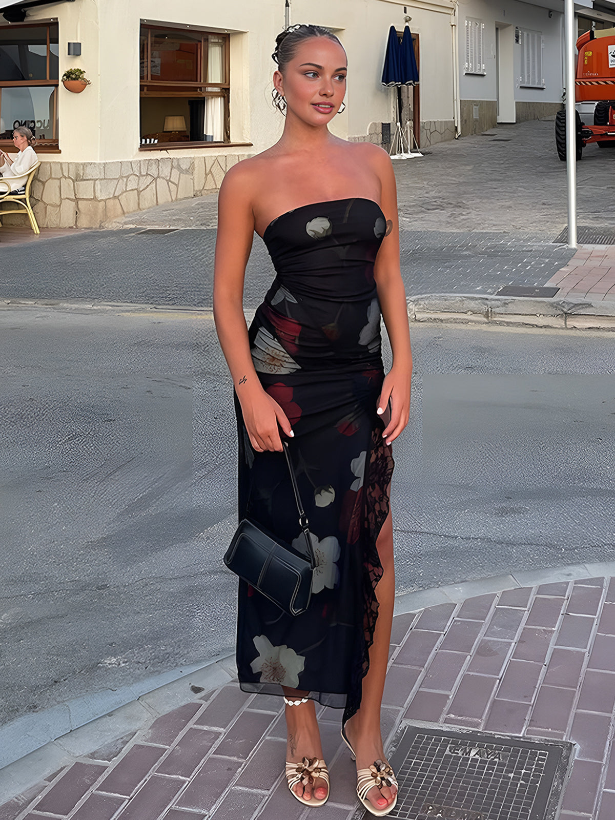 Çiçek Desenli Bölmeli Uyluk Tüp Midi Elbise