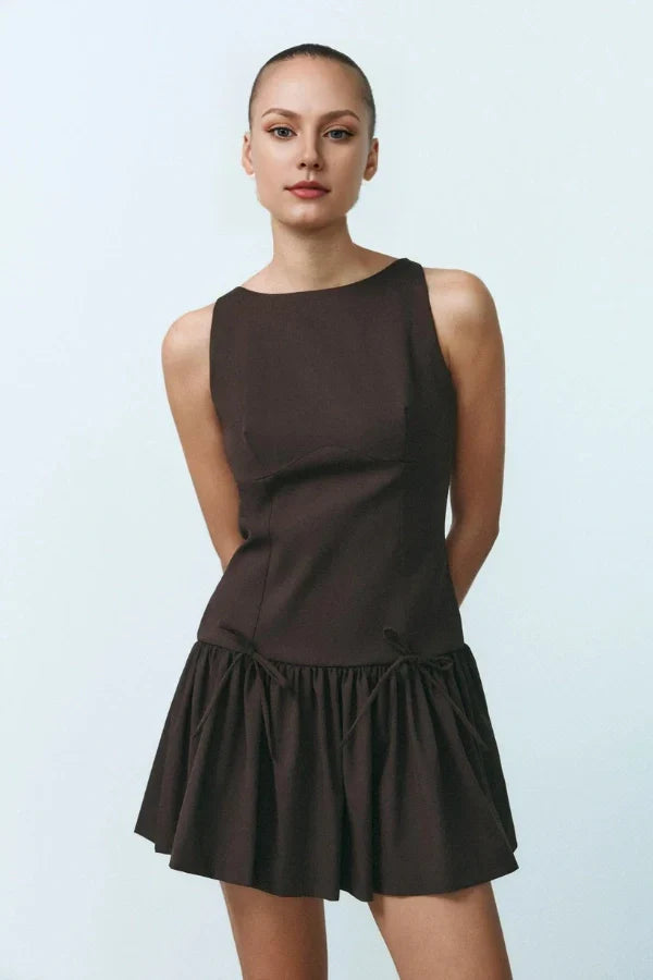 Kontrast Büstiyerli ve Fiyonklu Zarif Omuzları Açık Mini Elbise