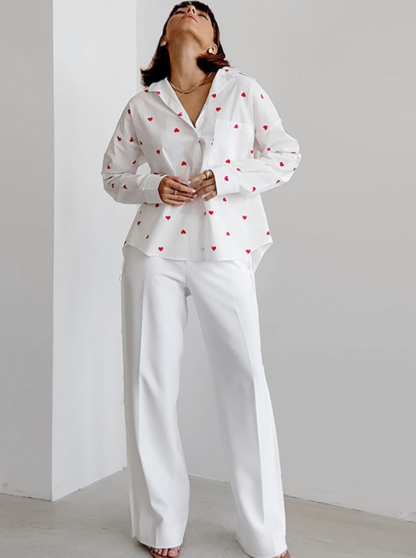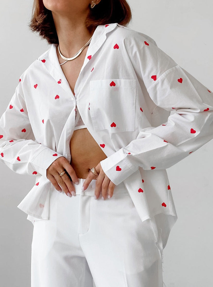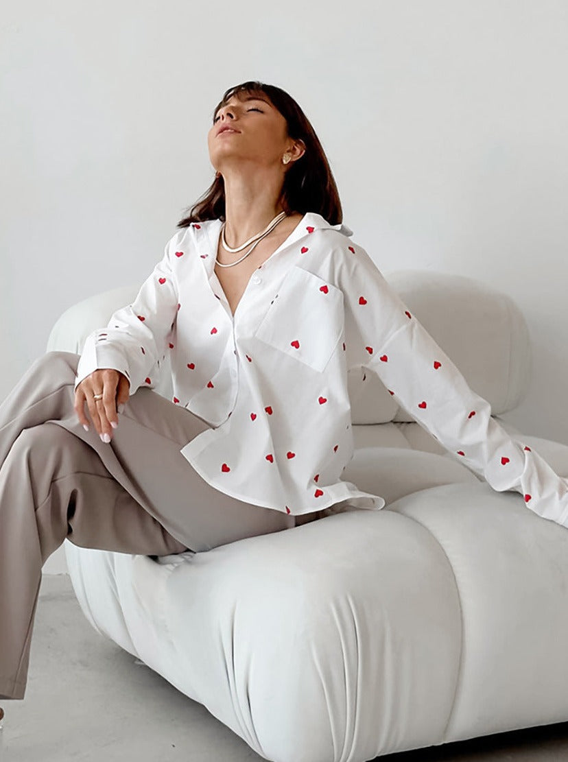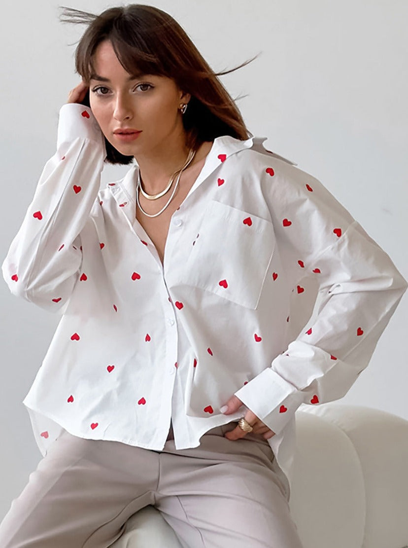 Heart Kalp Desenli Uzun Kollu Cepli Gömlek