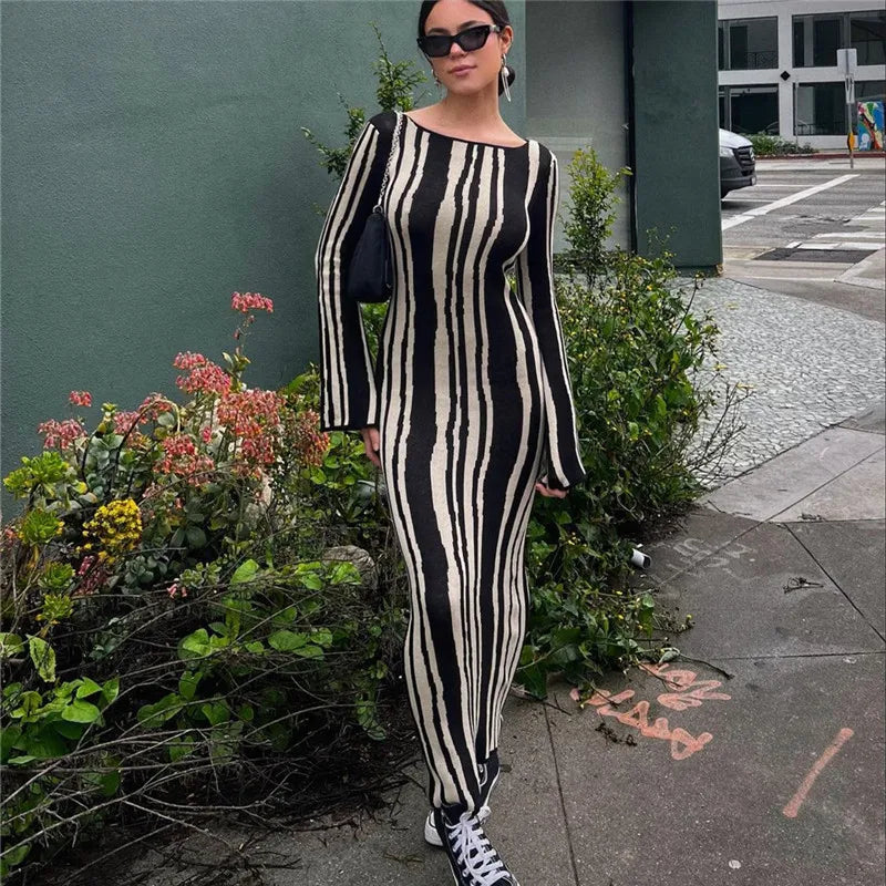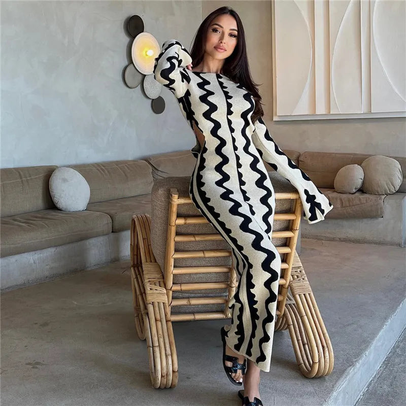 Desenli Uzun Kollu Bel Detaylı Maxi Elbise