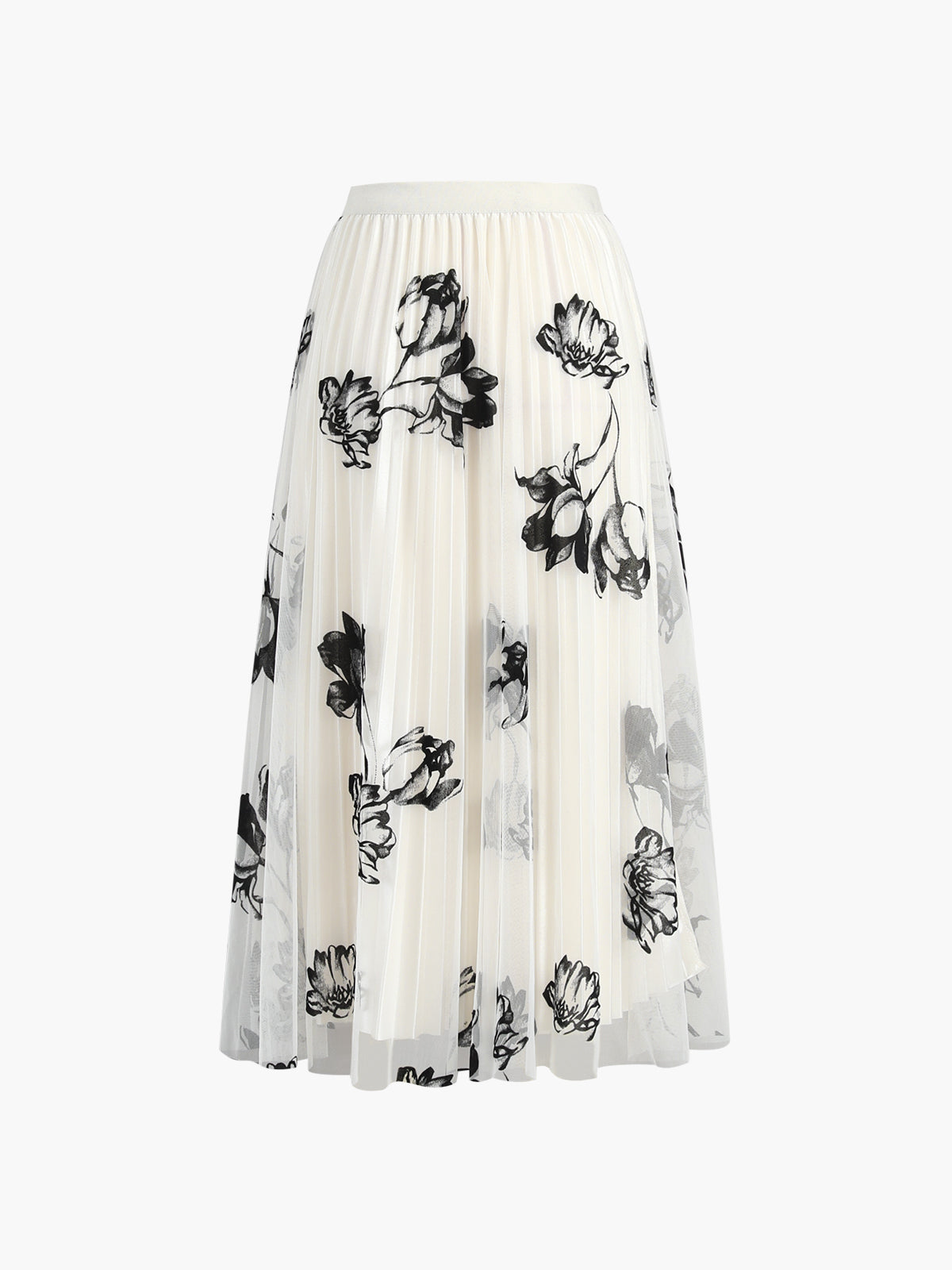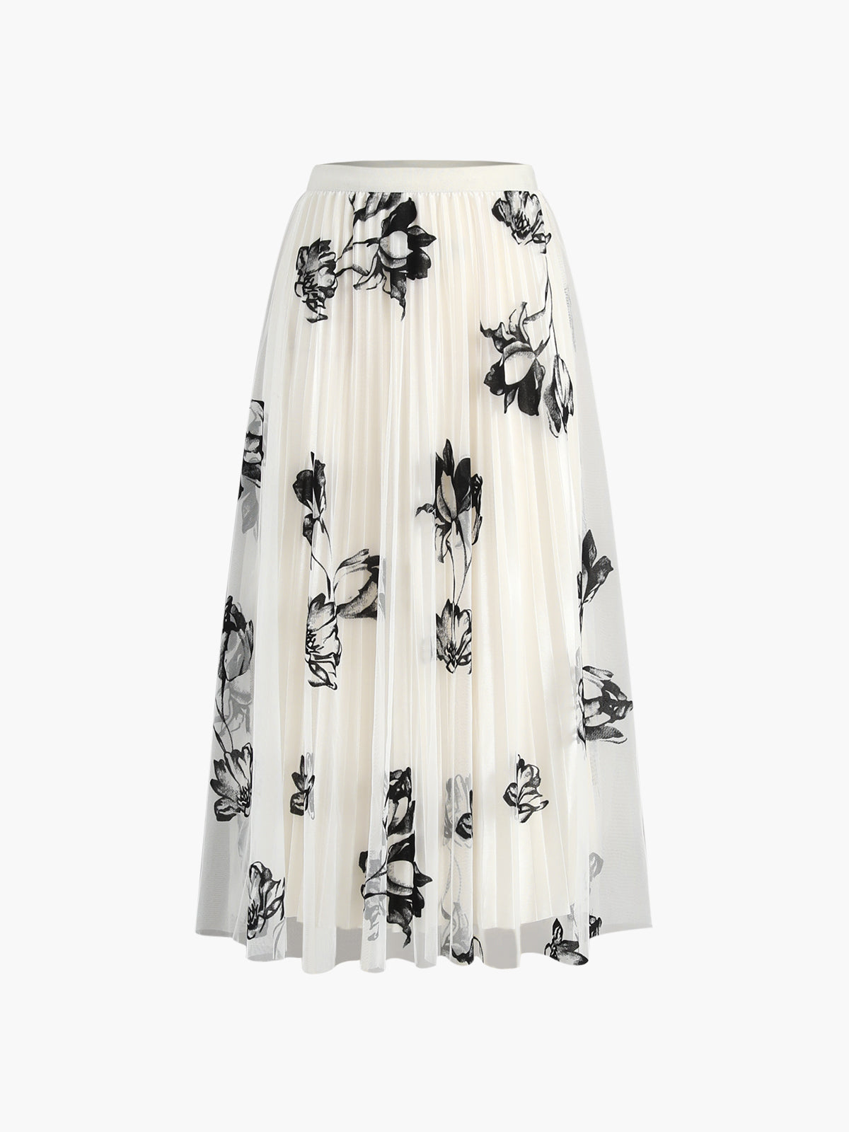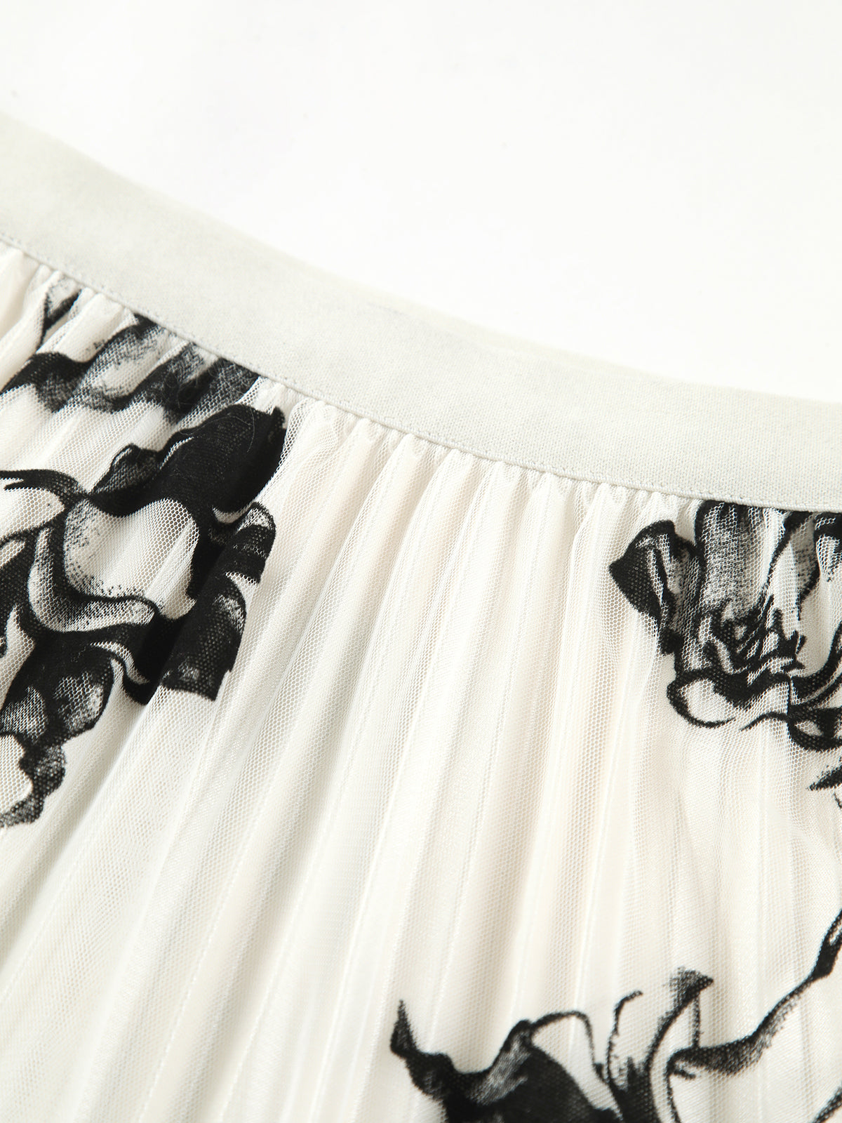 Mürekkep Boyama Baskı Çift Kat Pileli Midi Etek