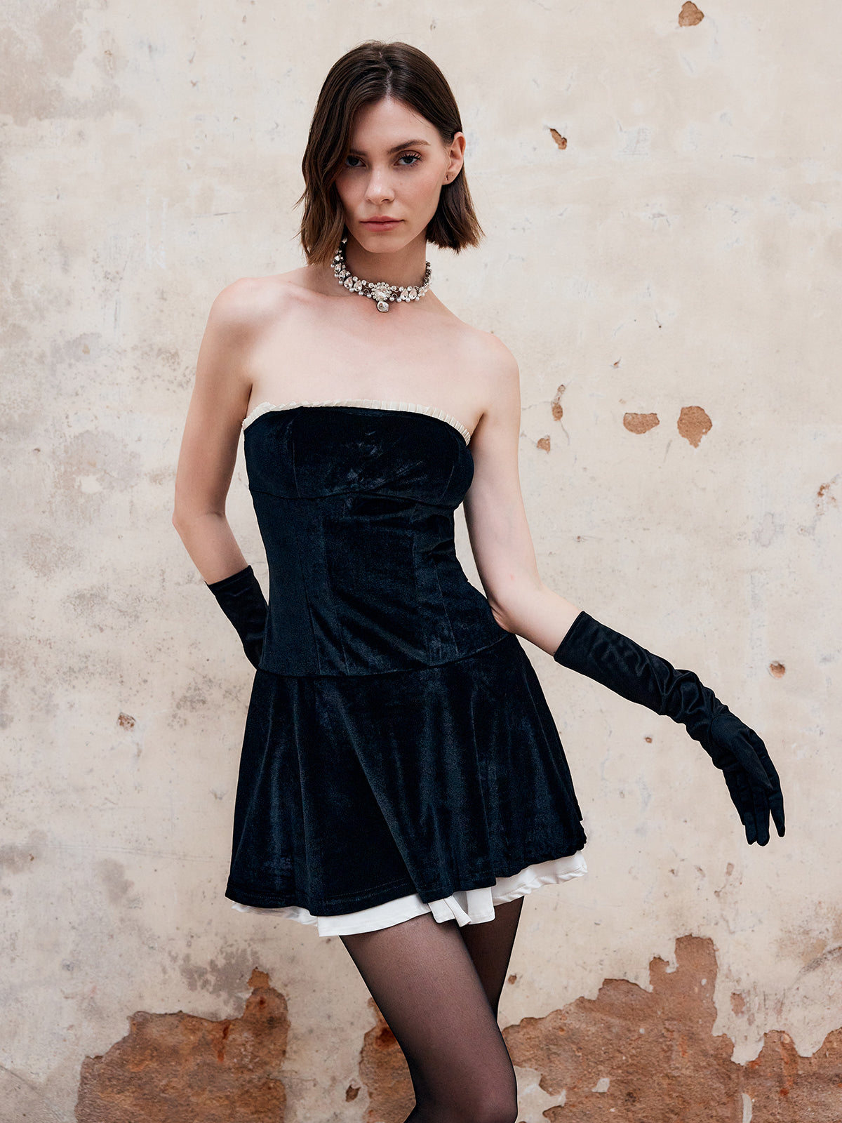 Dantel Pileli Tüp Kadife Kısa Elbise