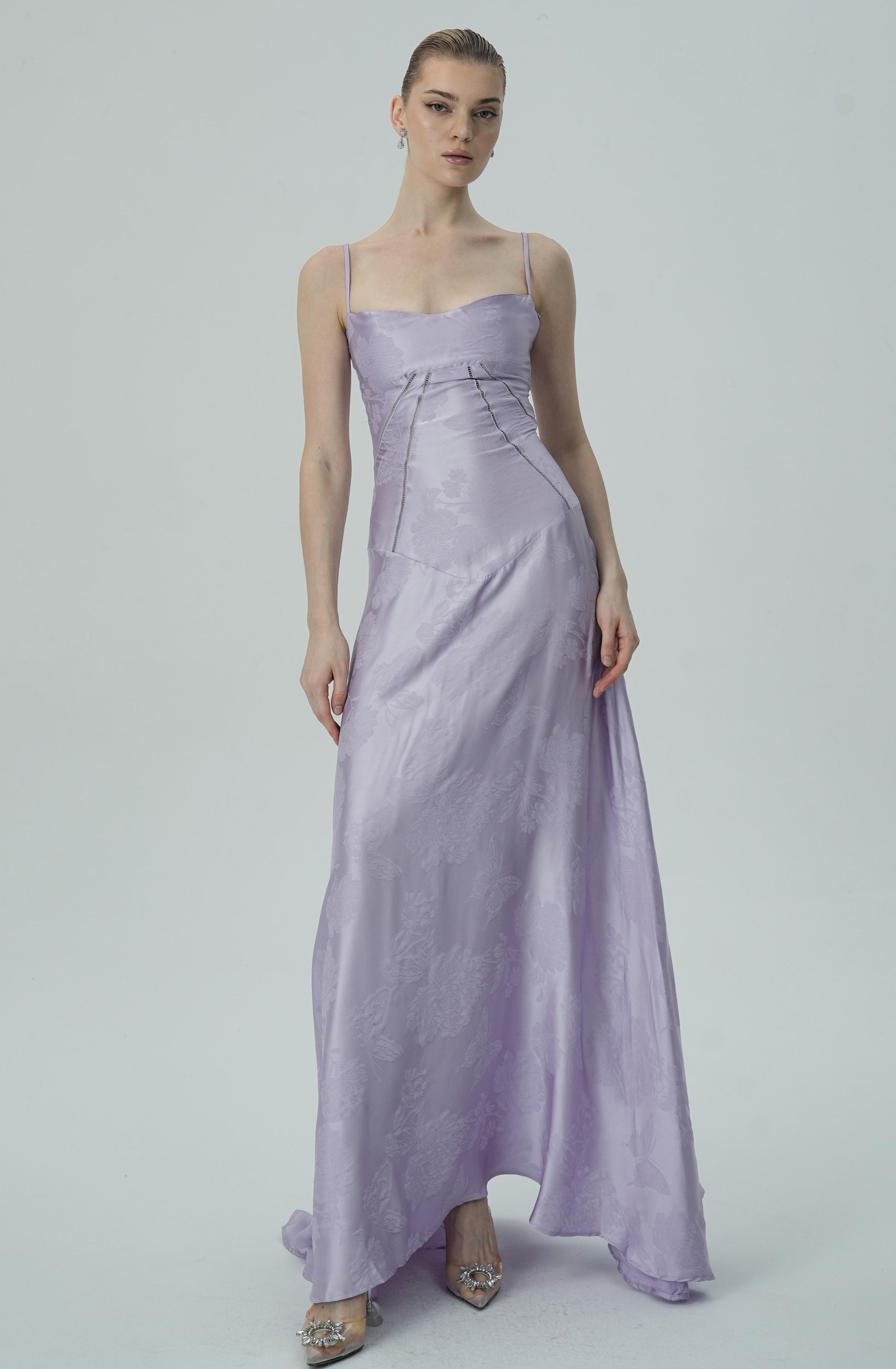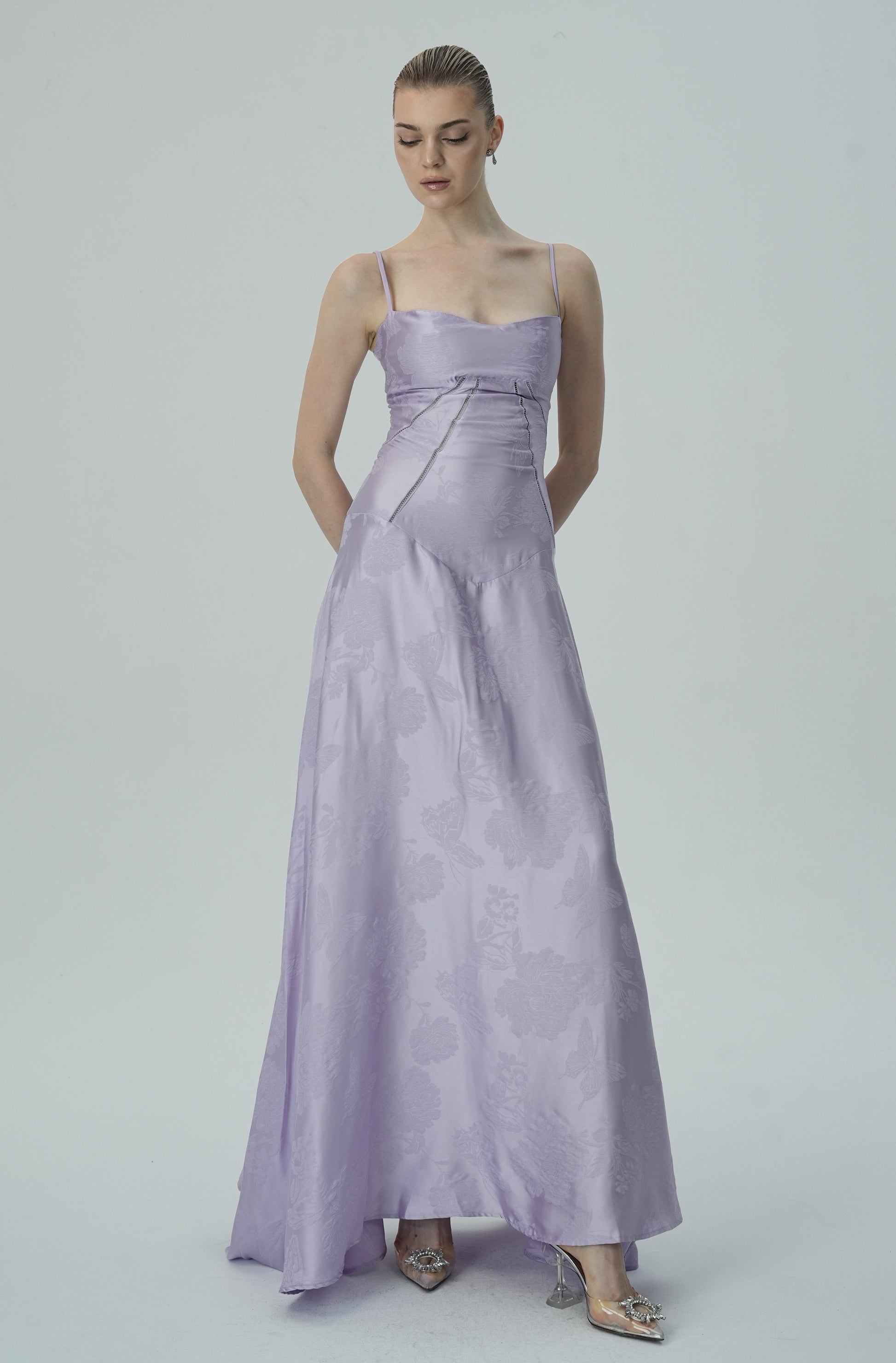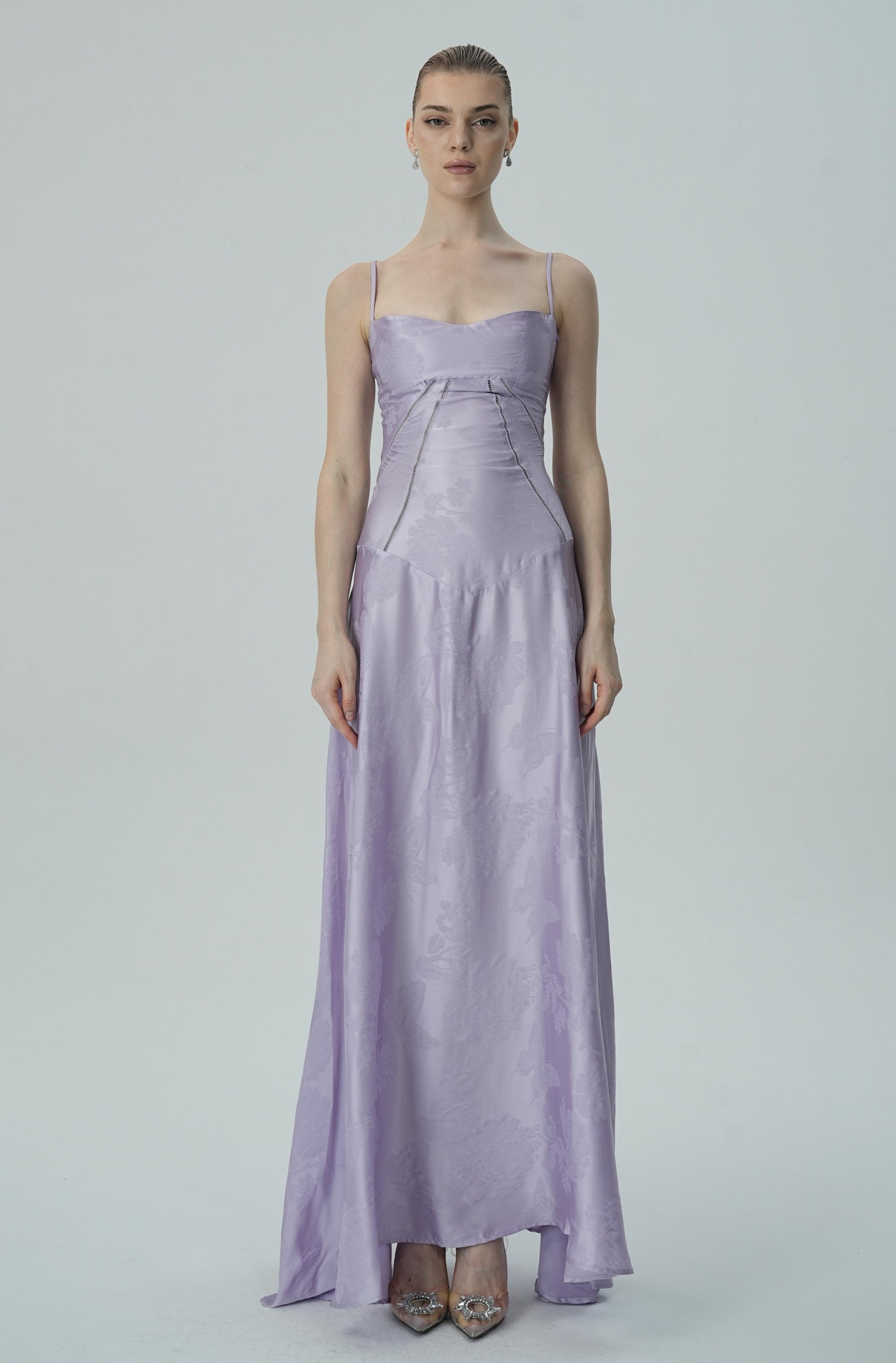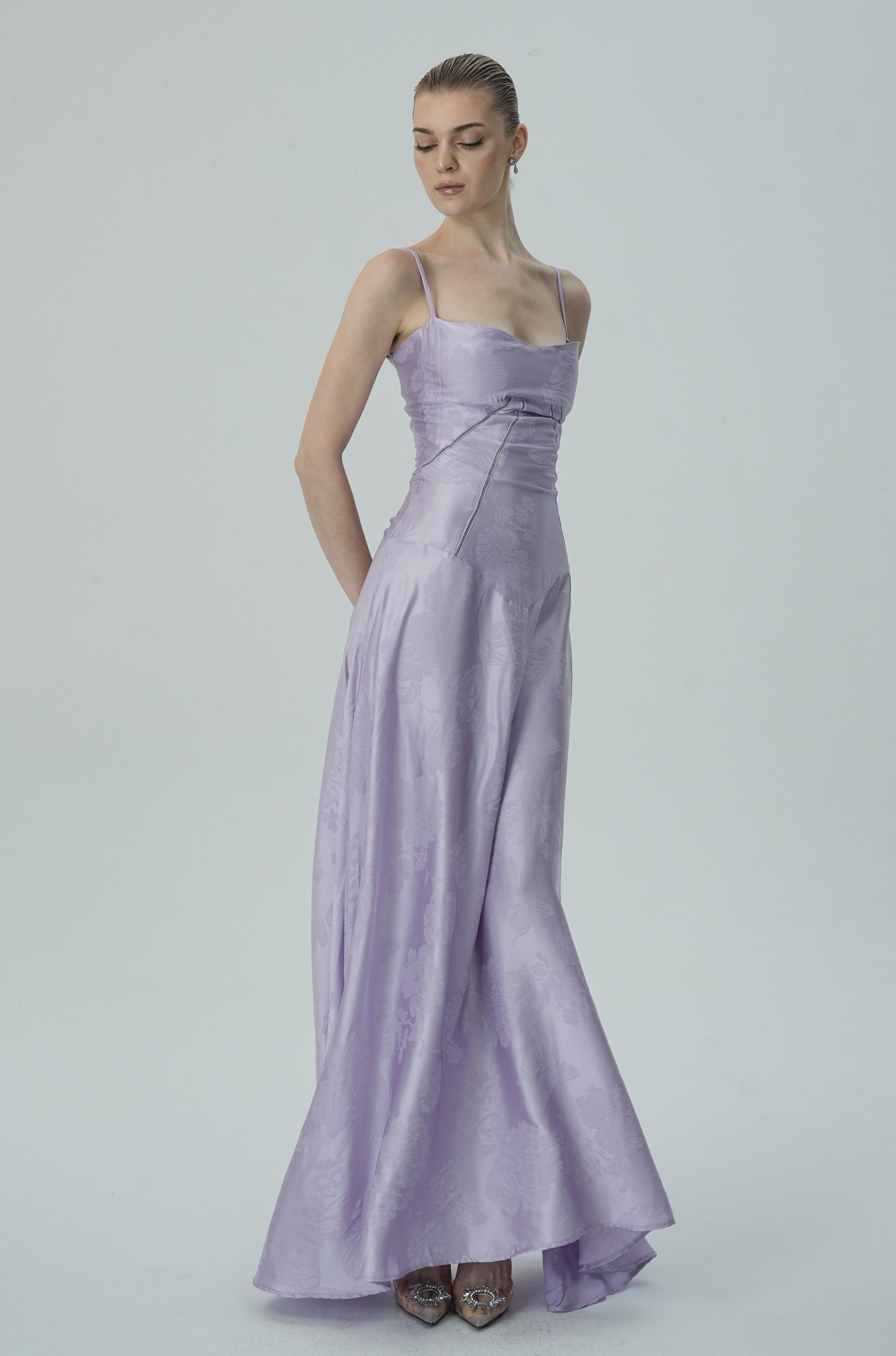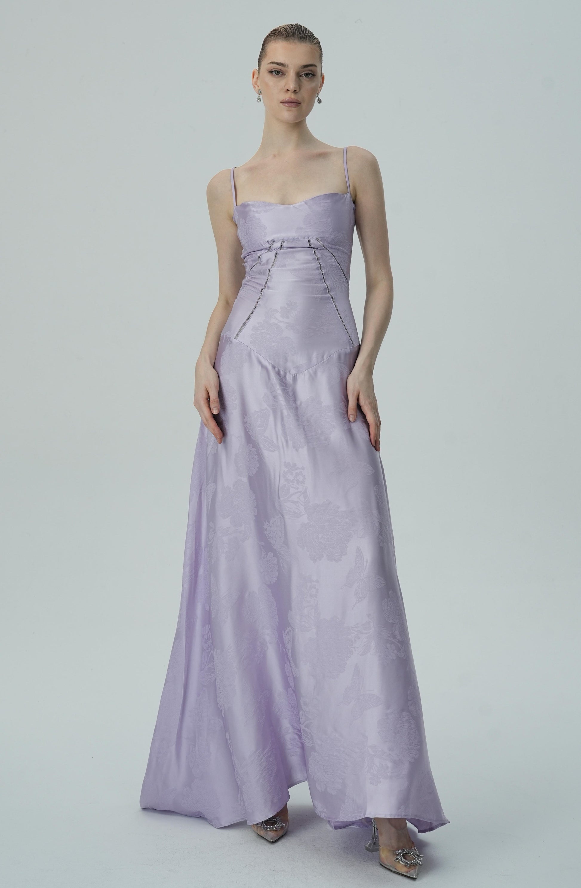 Bu göz alıcı lavanta rengi saten maxi elbise, zarif çiçek jakar deseni, ince askıları ve akıcı etek kesimiyle sofistike ve lüks bir görünüm sunuyor. Vücuda oturan korsaj üstü, figürü mükemmel bir şekilde tamamlayarak şık ve feminen bir siluet oluştururken, maxi boy eteği zarif ve akıcı bir hareket sağlar.
