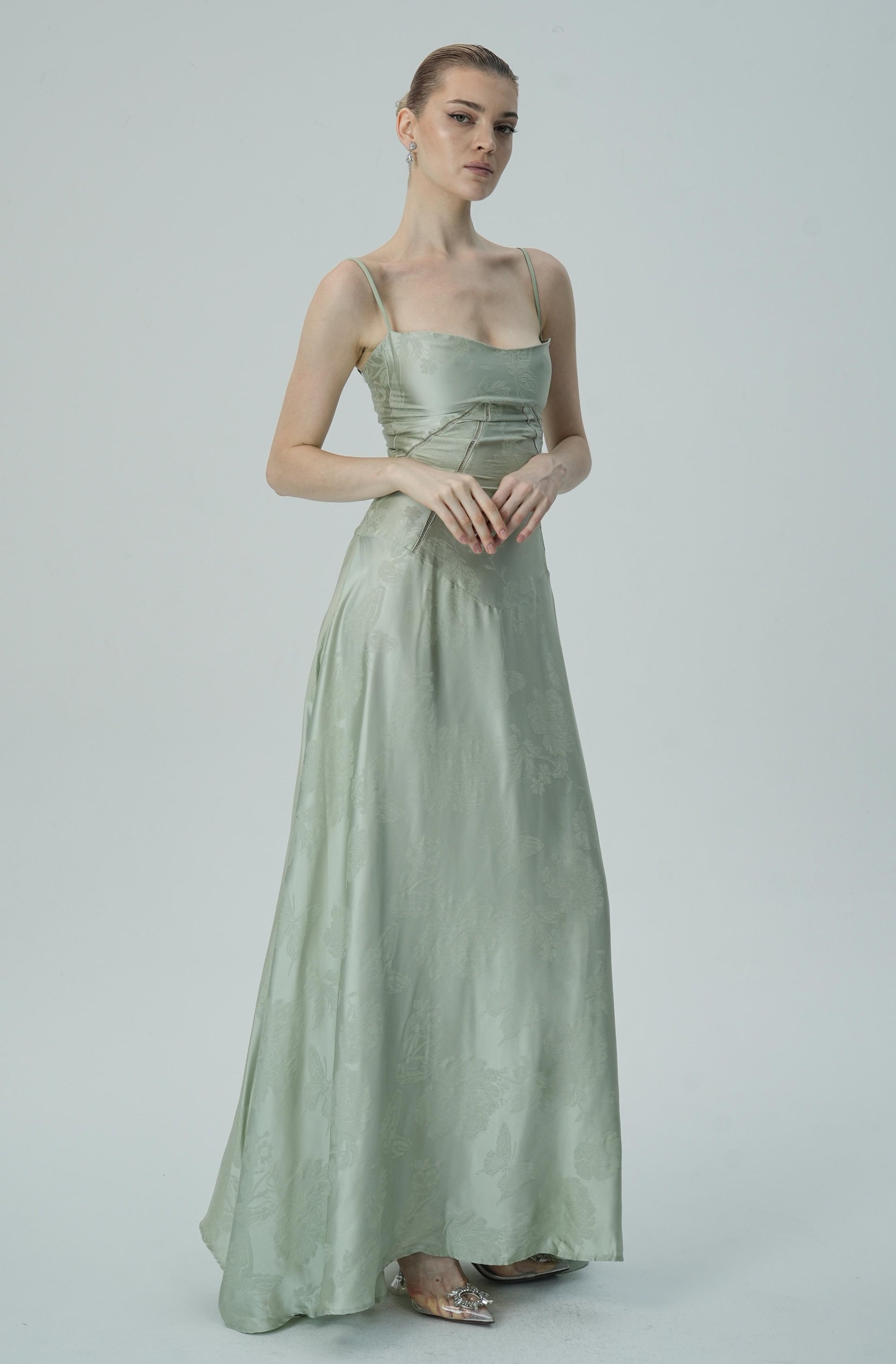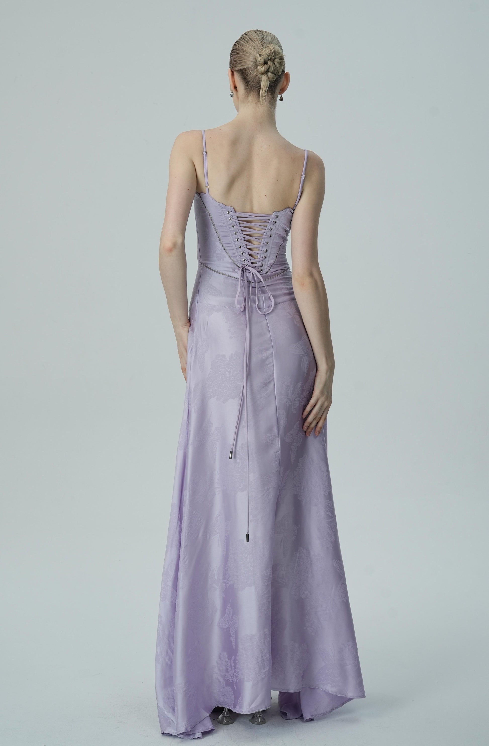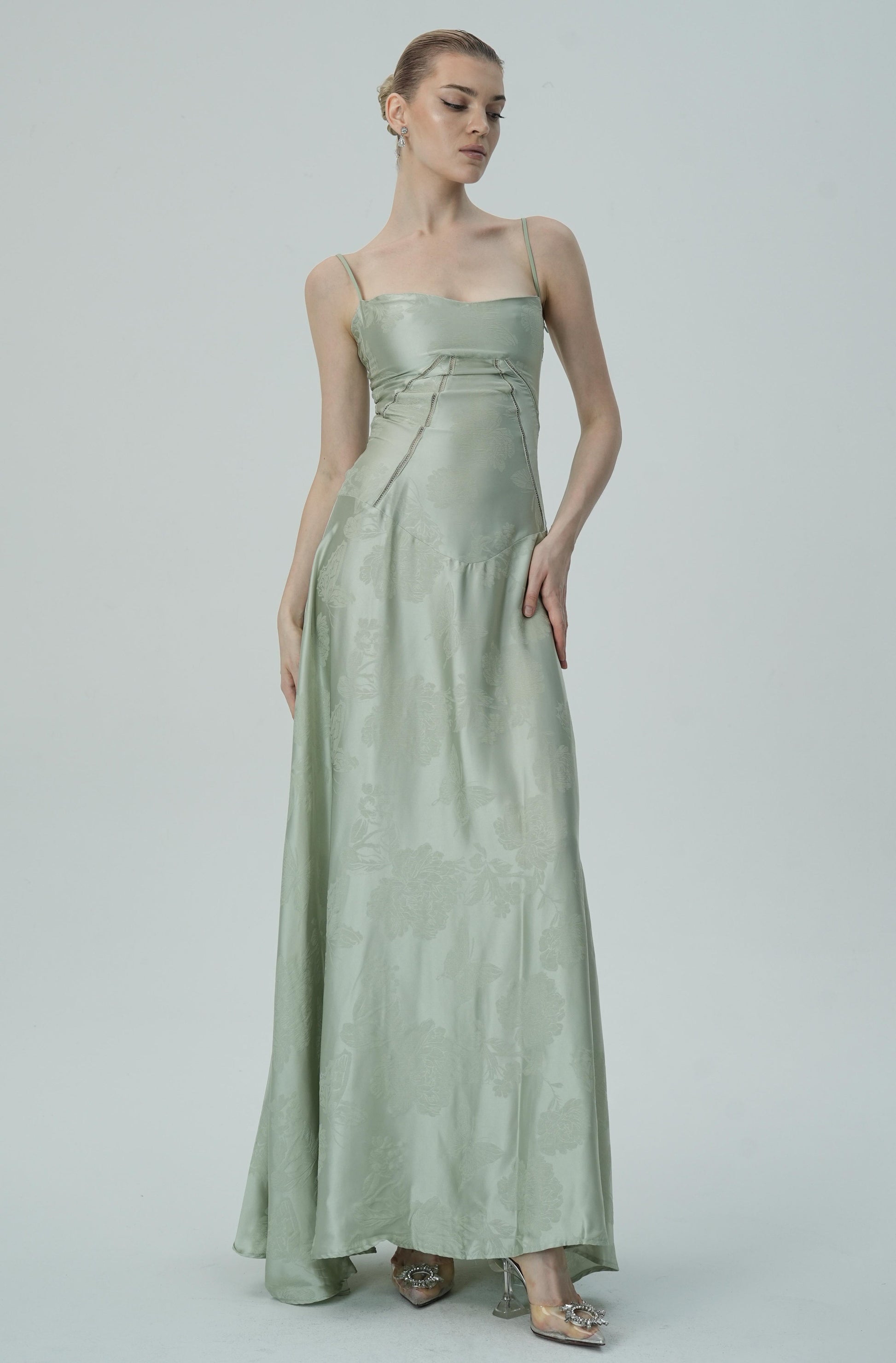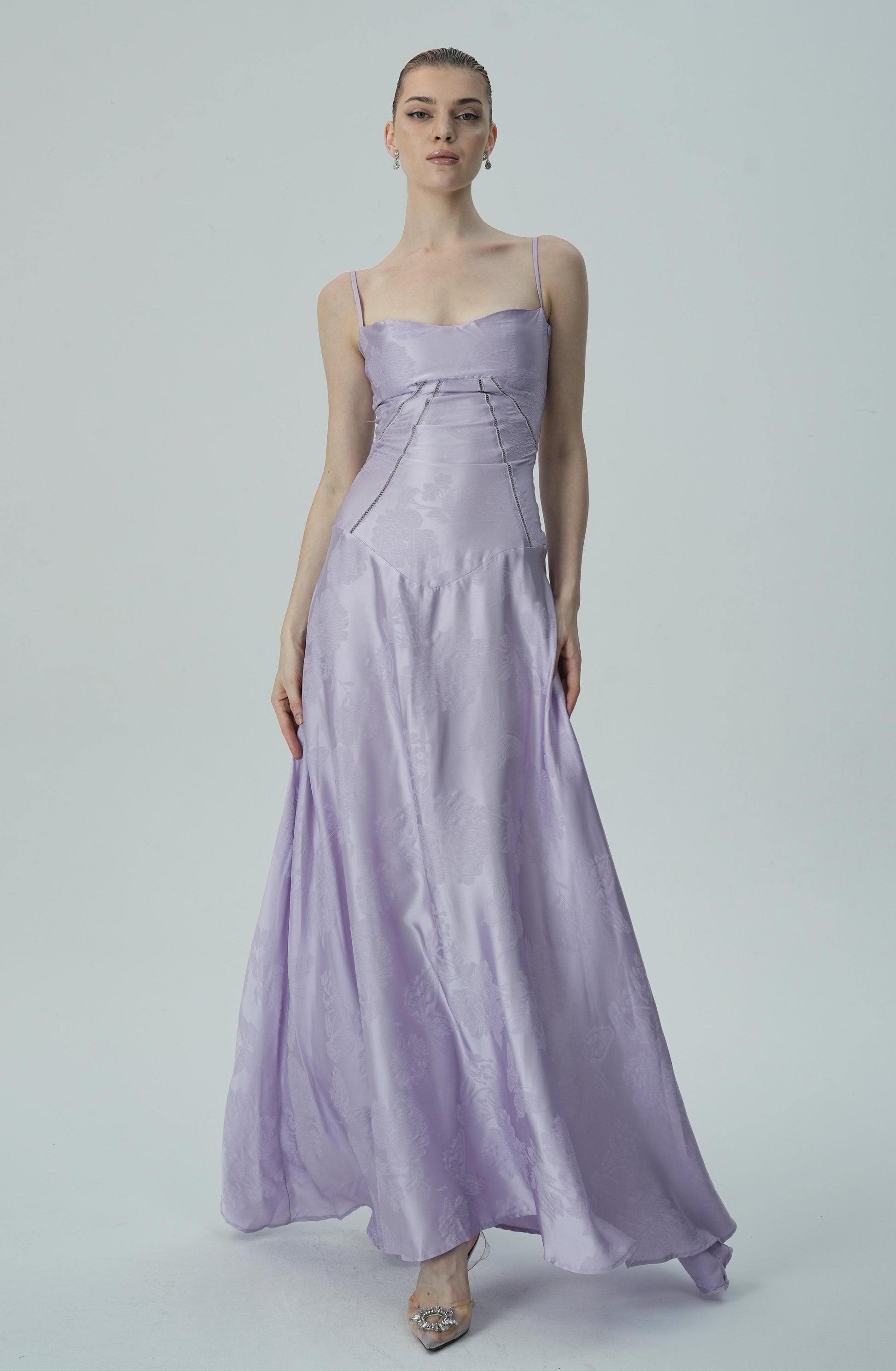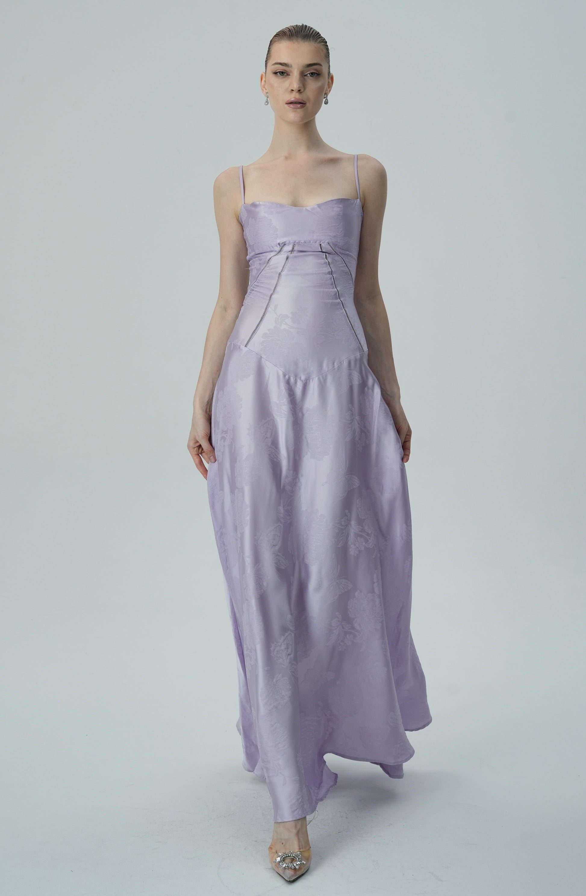 Bu göz alıcı lavanta rengi saten maxi elbise, zarif çiçek jakar deseni, ince askıları ve akıcı etek kesimiyle sofistike ve lüks bir görünüm sunuyor. Vücuda oturan korsaj üstü, figürü mükemmel bir şekilde tamamlayarak şık ve feminen bir siluet oluştururken, maxi boy eteği zarif ve akıcı bir hareket sağlar.